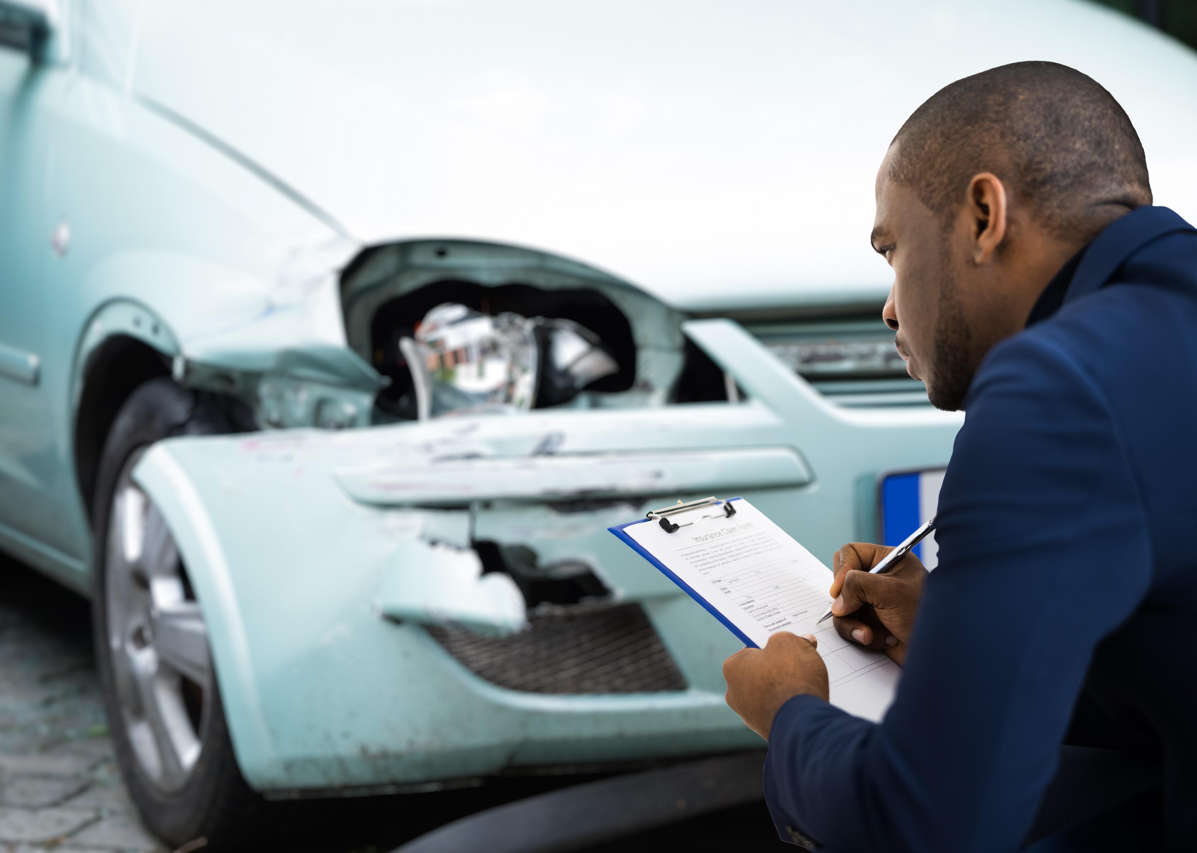 Car insurance agent inspecting accident claim