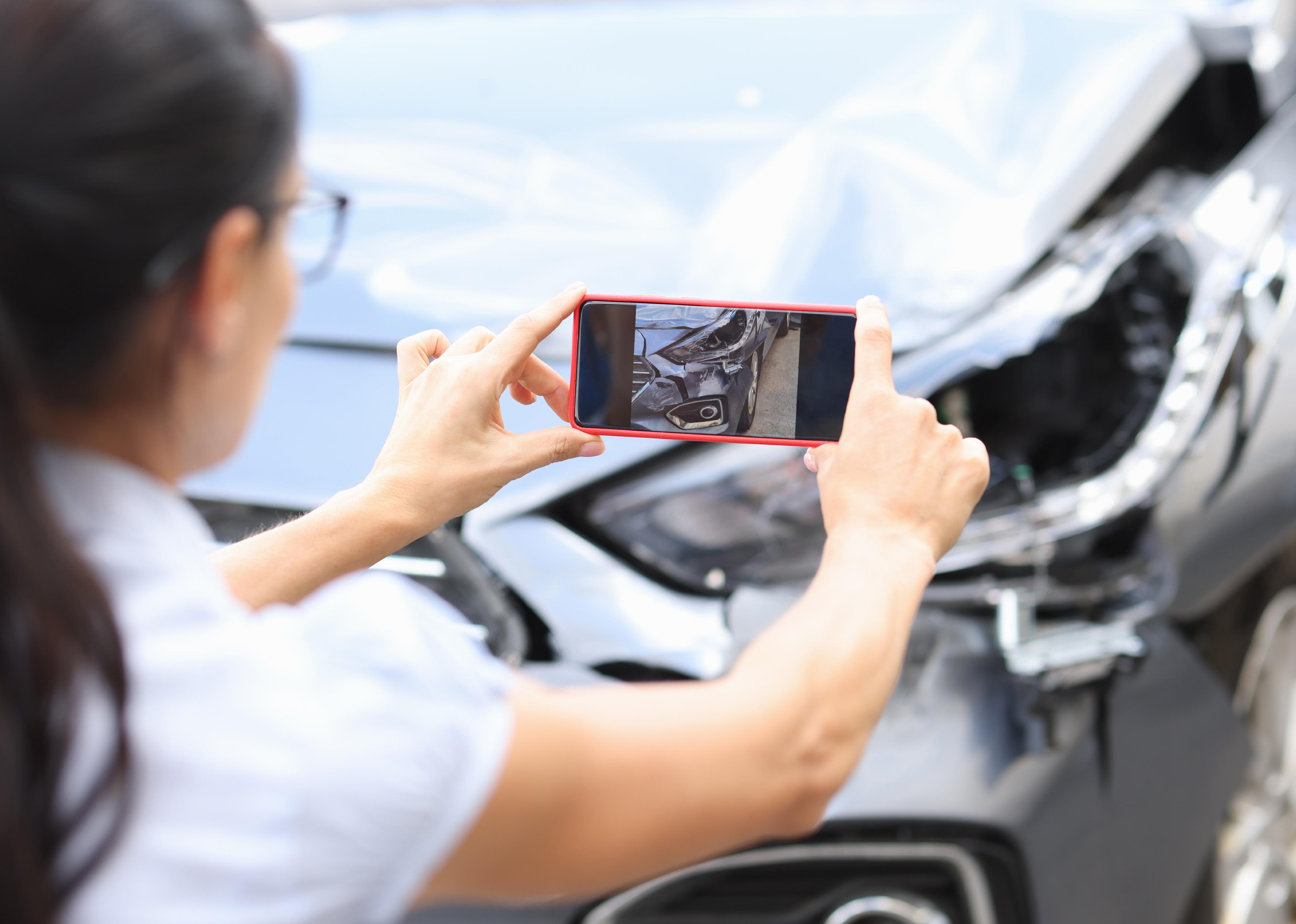 Woman photographs a broken car on smartphone and holds insurance documents in her hands