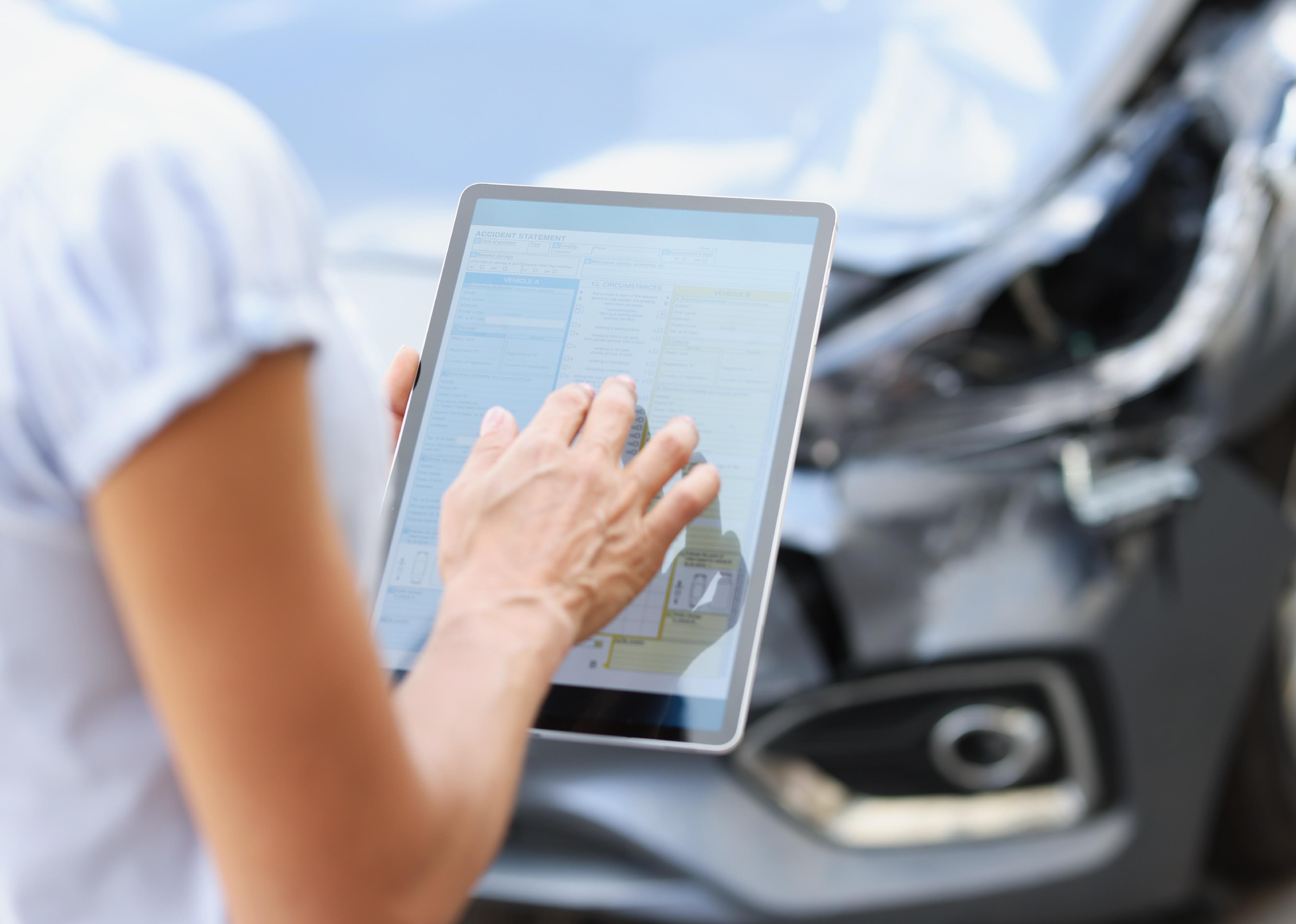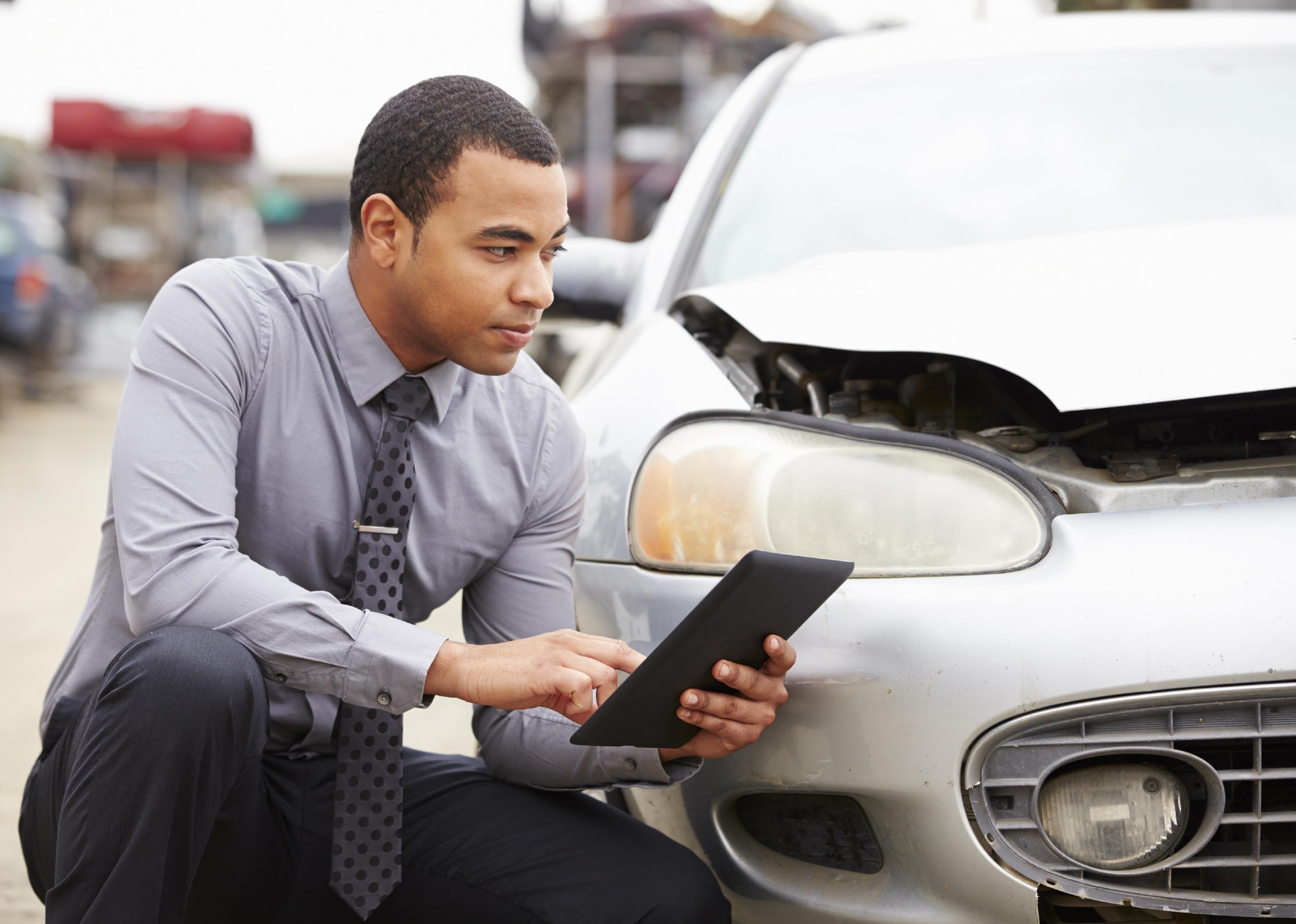 Loss Adjuster Using Digital Tablet In Car Wreck Inspection