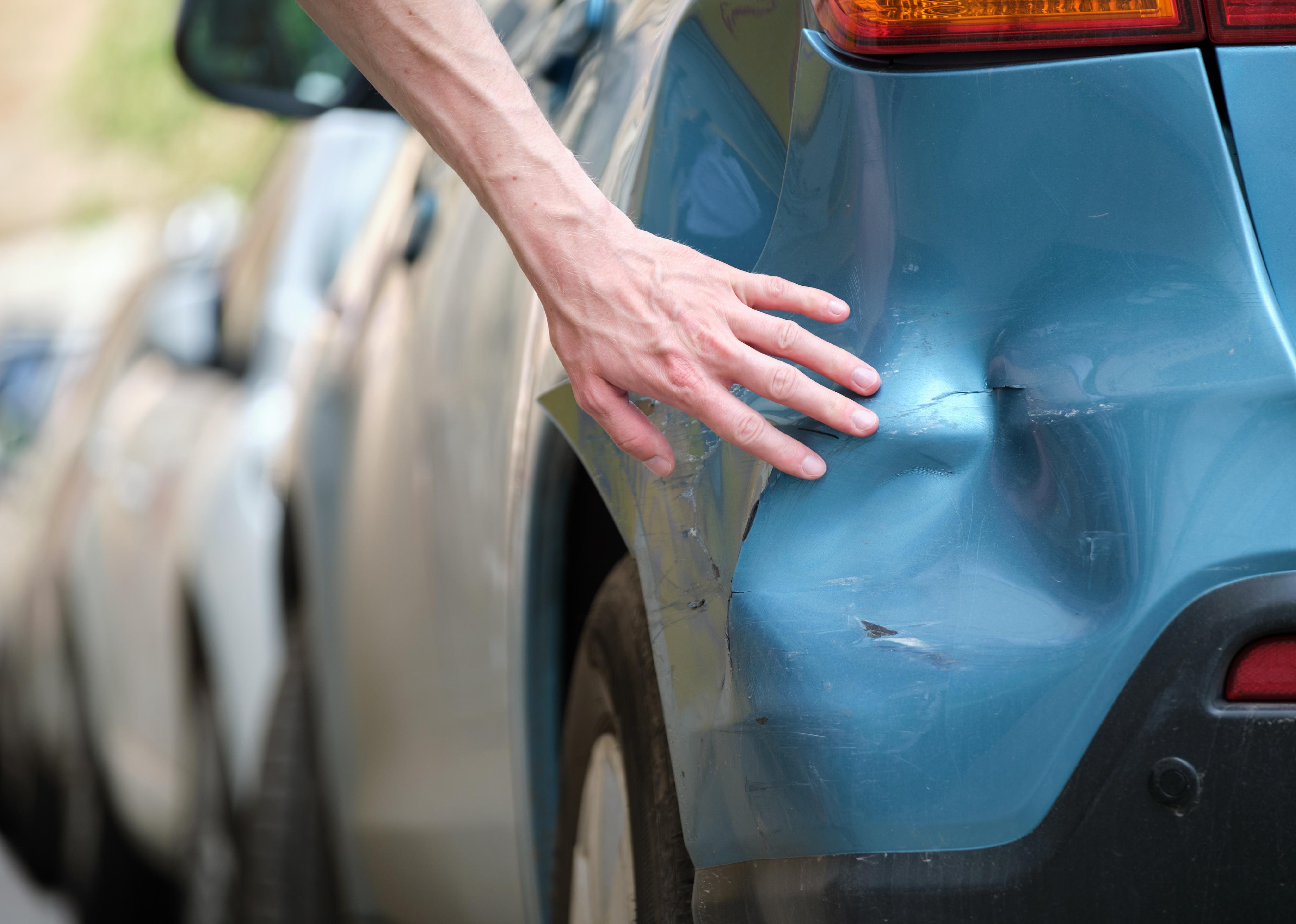 Driver hand examining dented car with damaged fender parked on city street side