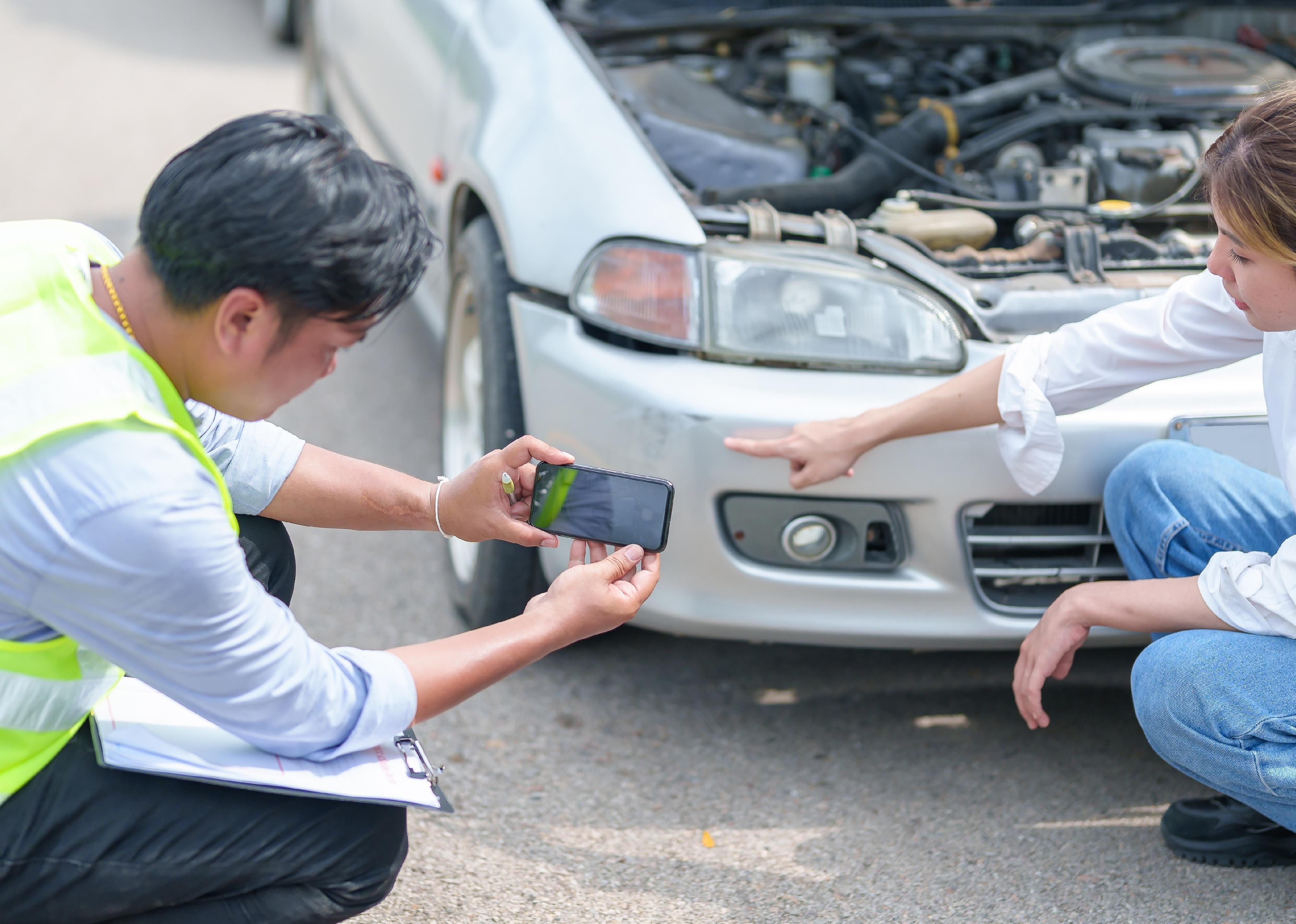 Agent takes pictures of damage to car after accident