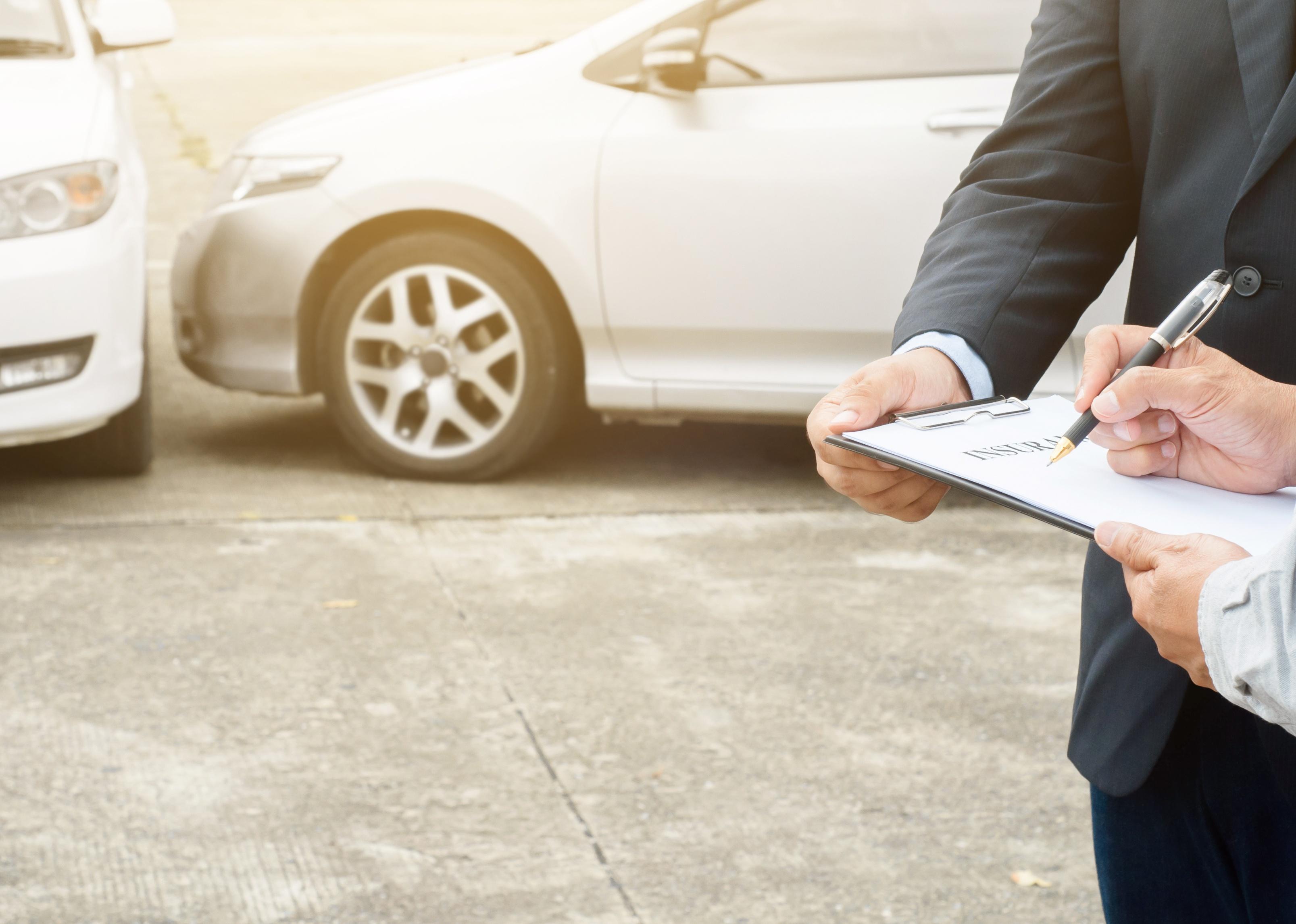 Insurance agent writing on clipboard while examining car