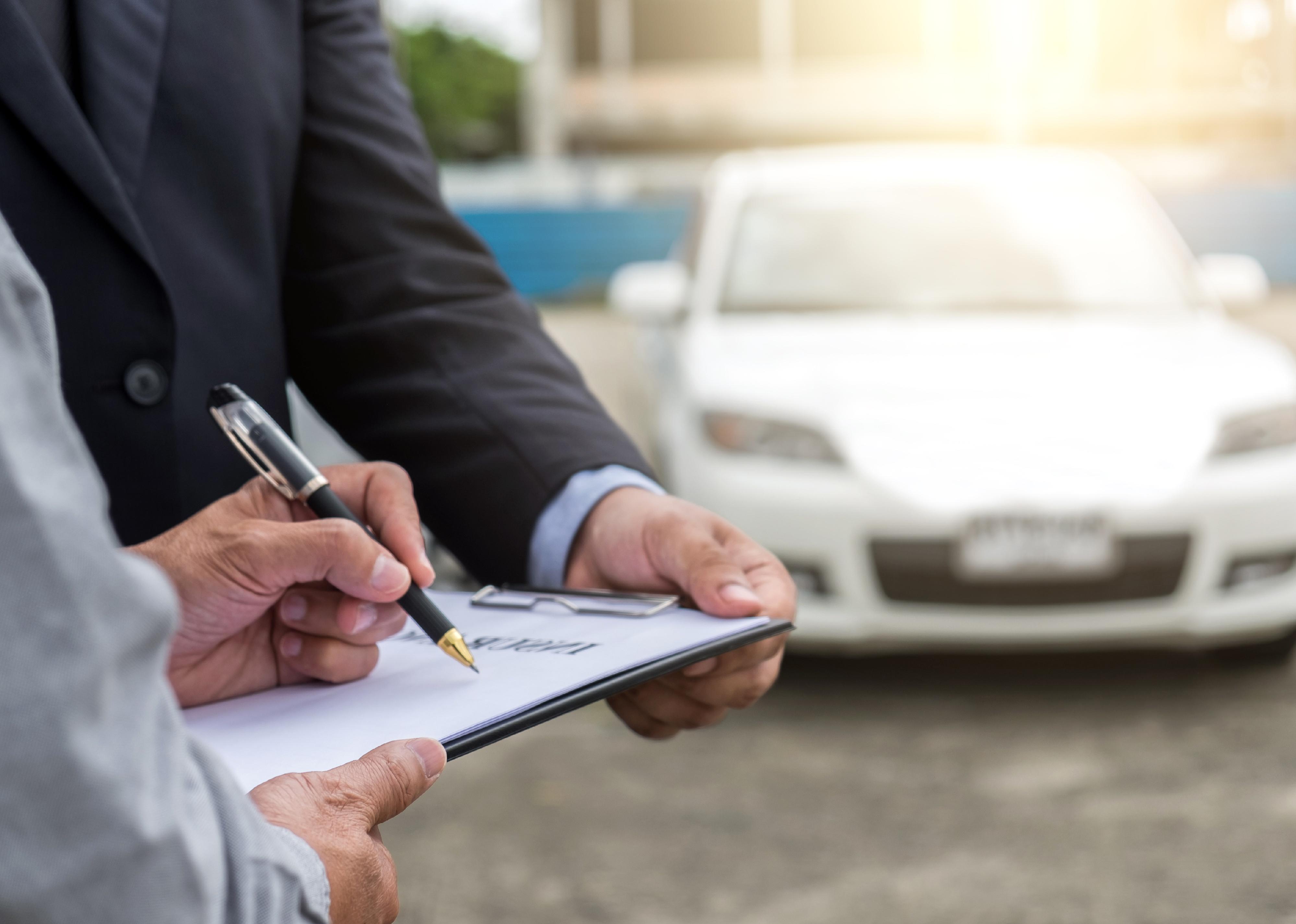 Insurance agent examines car and customer signs claim form