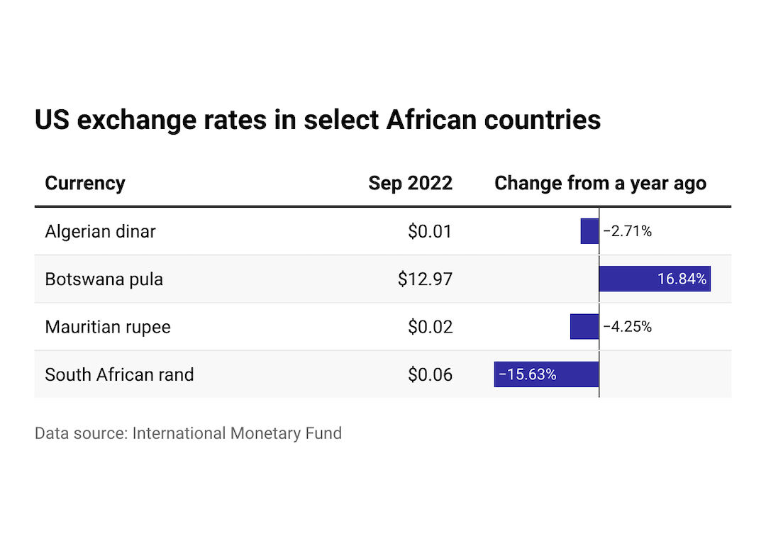 MoneyTransfers.com calculated the change in exchange rates from September 2021 to September 2022 using data from the International Monetary Fund. All amounts are recorded in U.S. dollars. Exchange rates are calculated as the U.S. price of a foreign currency.