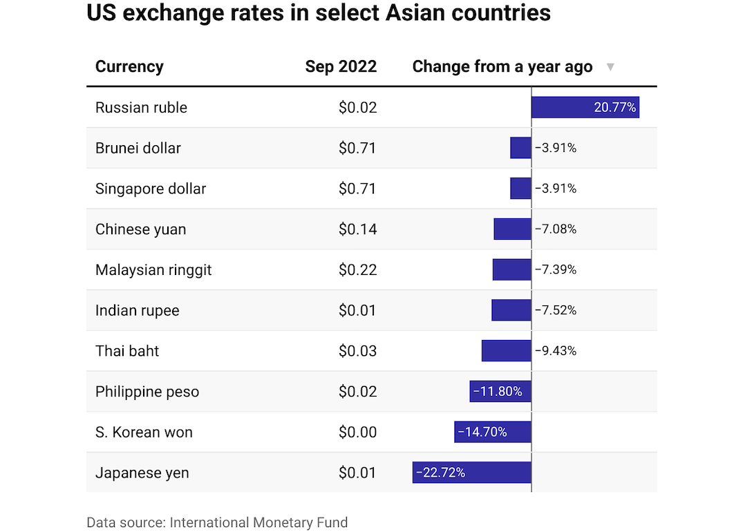 In Southeast Asia, the Thai bhat, Malaysian ringgit, and Philippine peso have also not been immune to the repercussions from rising interest rates within the U.S., and have also seen a fall in value.