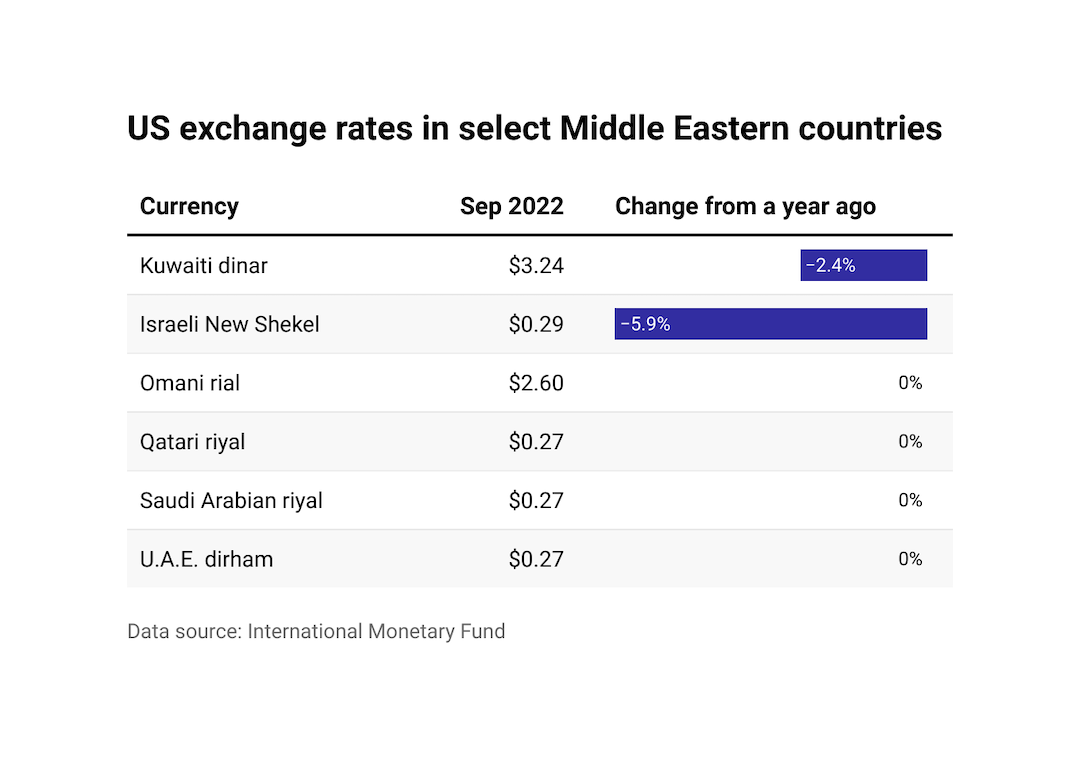 Because the Omani rial, Qatari riyal, Saudi Arabian riyal, and UAE dirham are all pegged to the U.S. dollar, their currency exchange rates have not changed. Countries in the Middle East do this for stability, as these oil-rich nations need the U.S. and China to remain significant trading partners.
