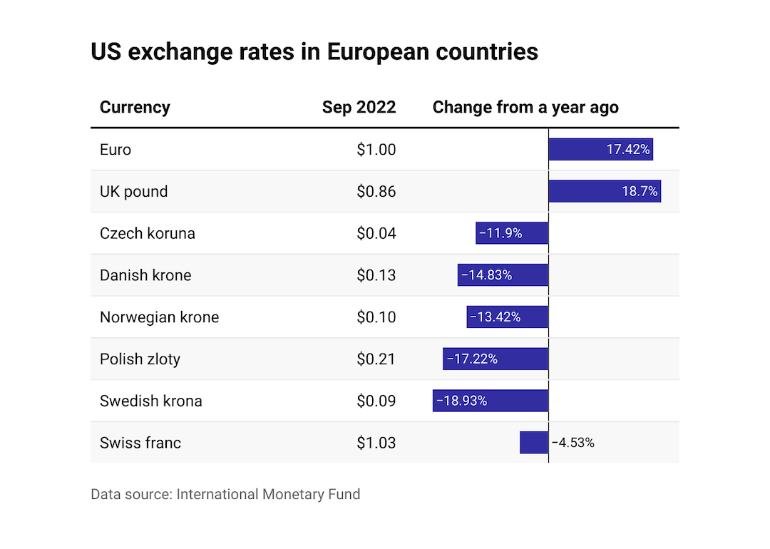 The Swedish krona and the Swiss franc also fall behind the dollar because of the Fed aggressively raising rates. Investors have traditionally viewed the Swiss franc as a safe haven due to two centuries of Swiss neutrality and, until recent years, strict banking secrecy laws. But even as one of the wealthiest countries in the world, Switzerland is not immune from European gas shortages and is being forced to conserve energy this winter.