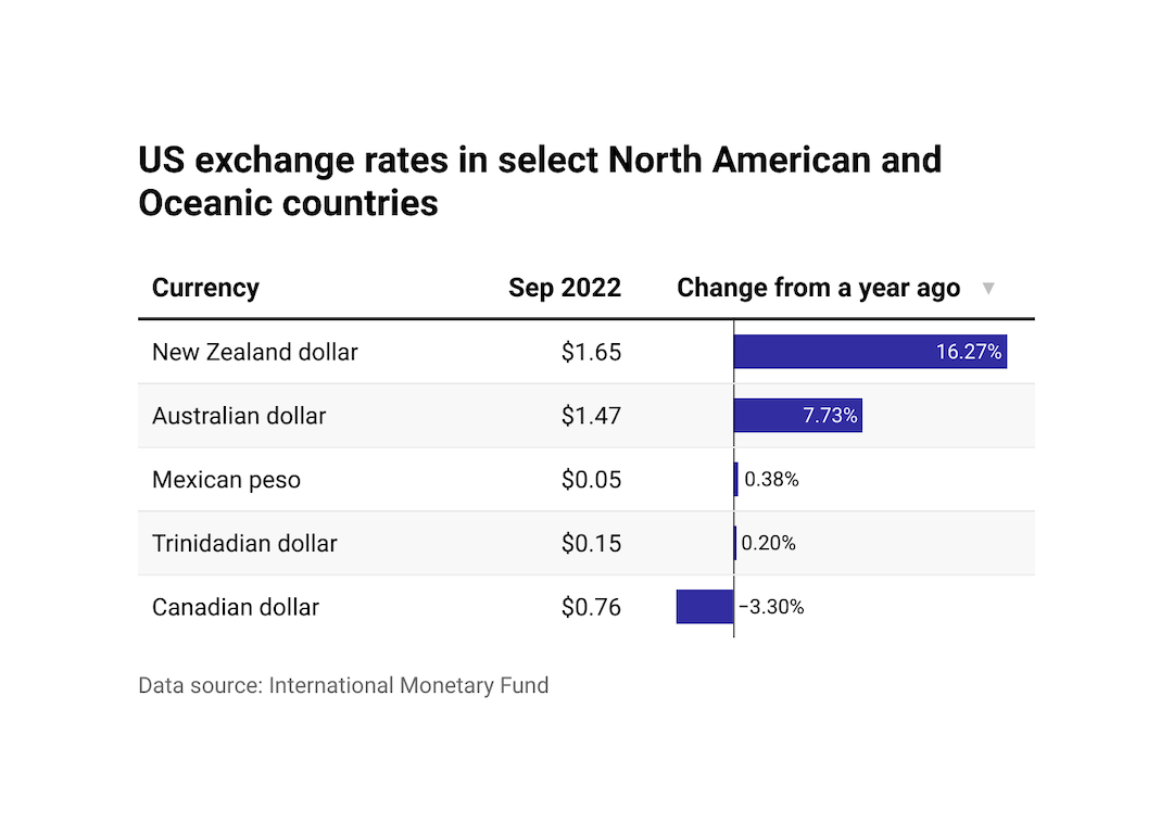 Exchange rates have mainly increased from the year before, except in Mexico, Australia, and some European countries. Many currencies worldwide are weakening due to the dollar being considered a safe haven by investors facing volatile economic times. The U.S.-China trade war, Russia’s invasion of Ukraine, and the resulting U.S. and allied governments’ sanctions, COVID-19 restrictions, oil price fluctuations, and food commodity spikes have all impacted the value of global currencies. Currencies pegged to other currencies—such as those pegged at a fixed rate to the euro—have gone down in value.