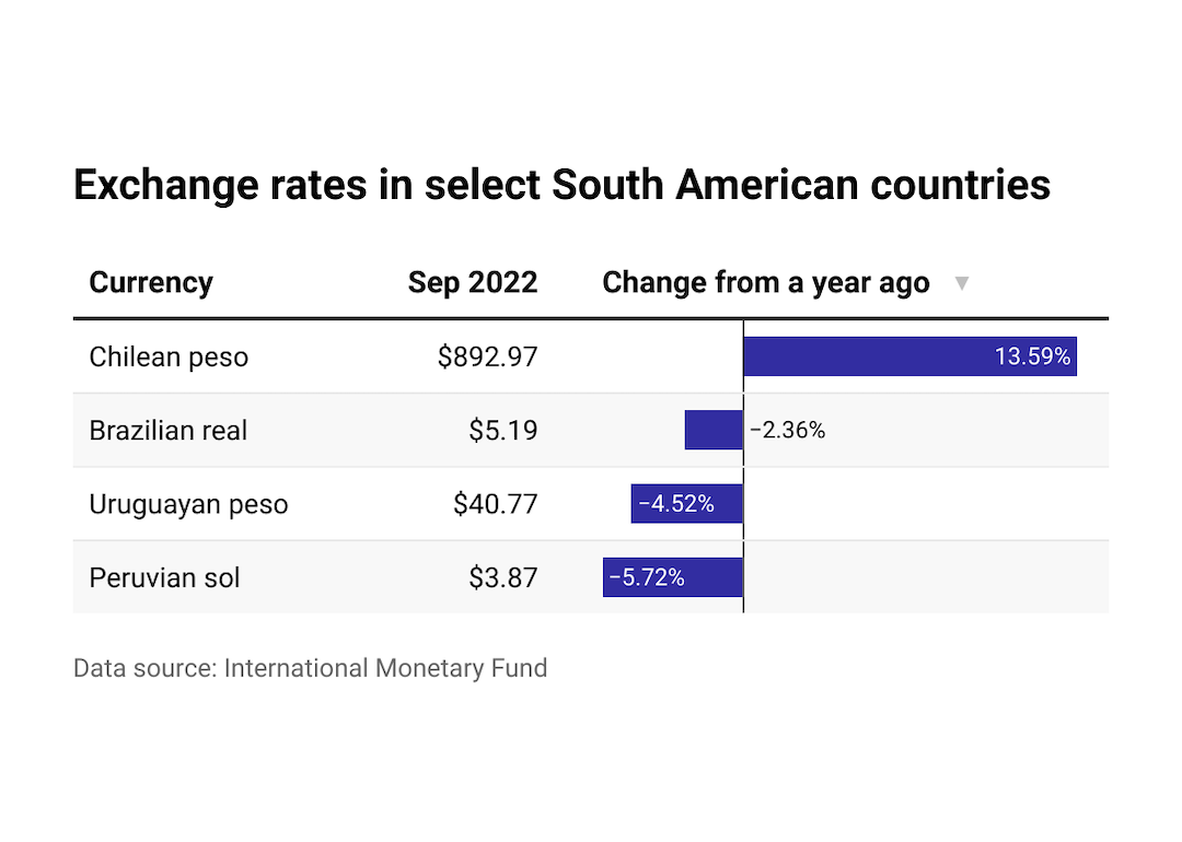 Though it was slightly up at the beginning of September, the Chilean peso’s value has decreased for many reasons. Chile is the world’s leading copper exporter, a highly volatile commodity associated with industrial and housing construction demand for metal worldwide. Chileans have recently experienced political instability, with voters rejecting a new constitution in early September. That followed the government agreeing in August to a credit line deal with the International Monetary Fund.
