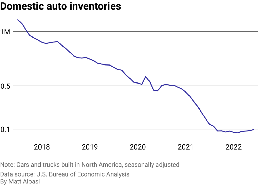 To better understand the state of the car industry today, Jerry analyzed data from the U.S. Bureau of Economic Analysis and Bureau of Labor Statistics that tracks inventory, prices, and sales of vehicles. The U.S. Bureau of Economic Analysis includes cars made overseas but sold in the U.S. in its data. The charts show data from July 2017-June 2022.