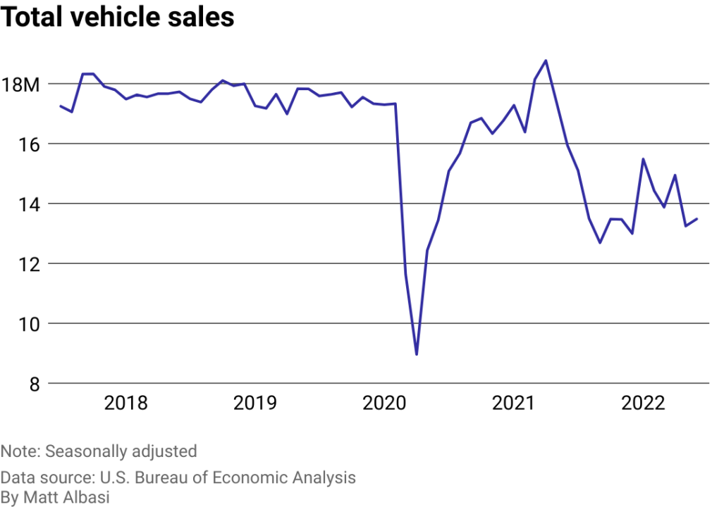 When sales bounced back, they did so equally as dramatically. Sales jumped to levels not seen in more than a decade, and certainly not in the last five years, according to Bureau of Economic Analysis data. The average cost of a new vehicle hit a record high in the summer of 2022 by reaching $48,182 in July, according to Kelley Blue Book.