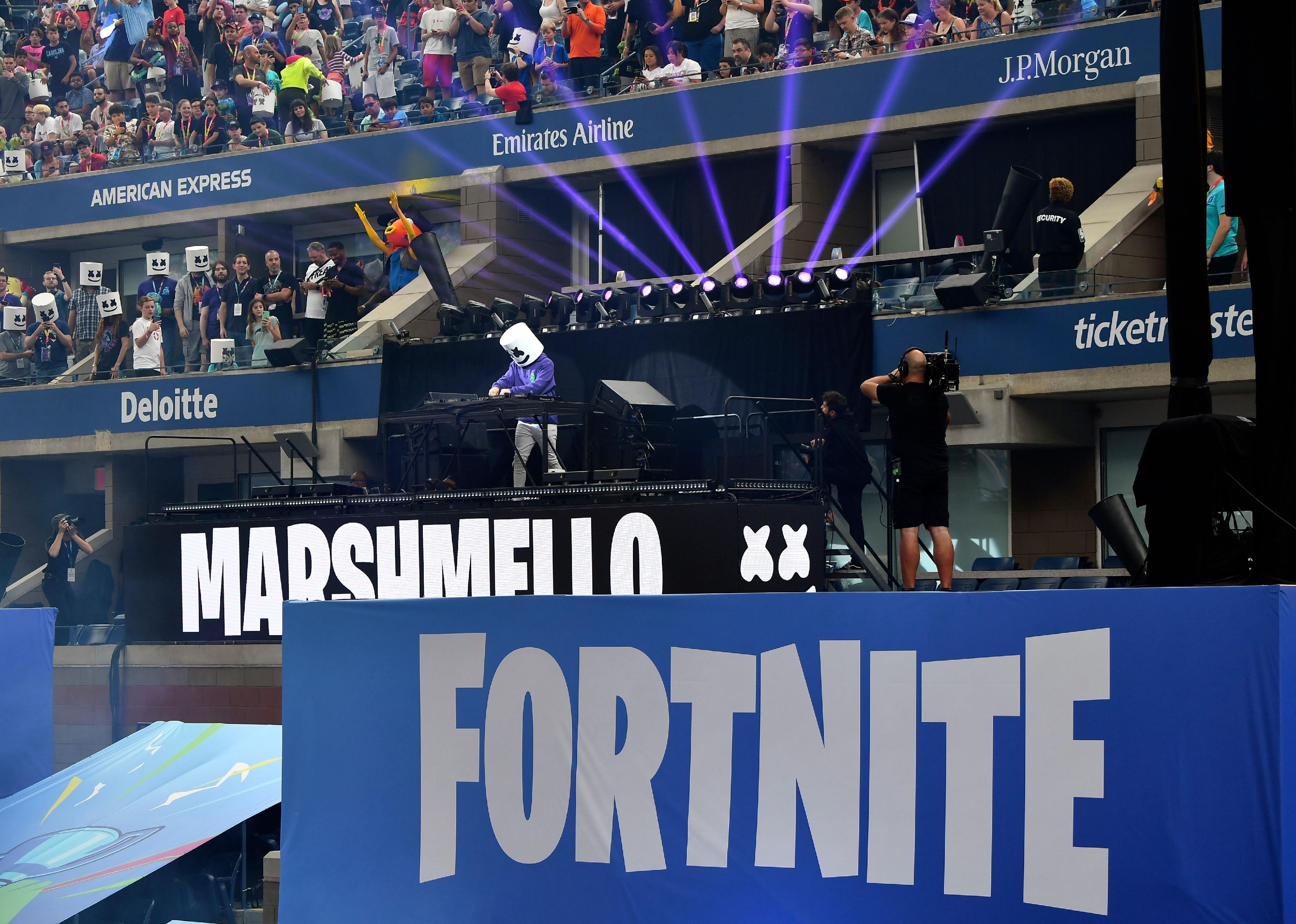 Dj Marshmello performs ahed of the final of the Solo competition at the 2019 Fortnite World Cup.
