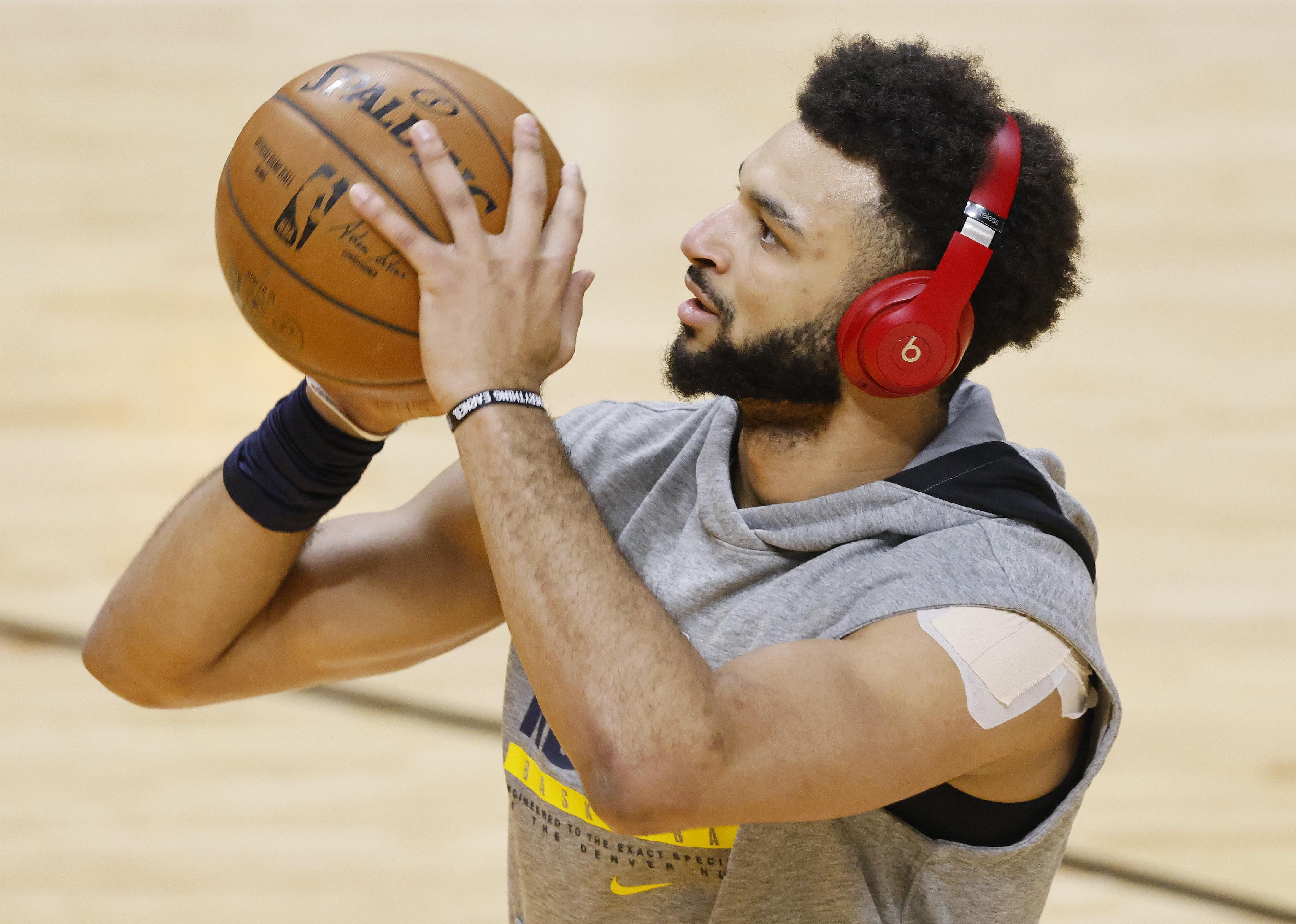 Jamal Murray of the Denver Nuggets warms up and wears a pair of Beats Headphones