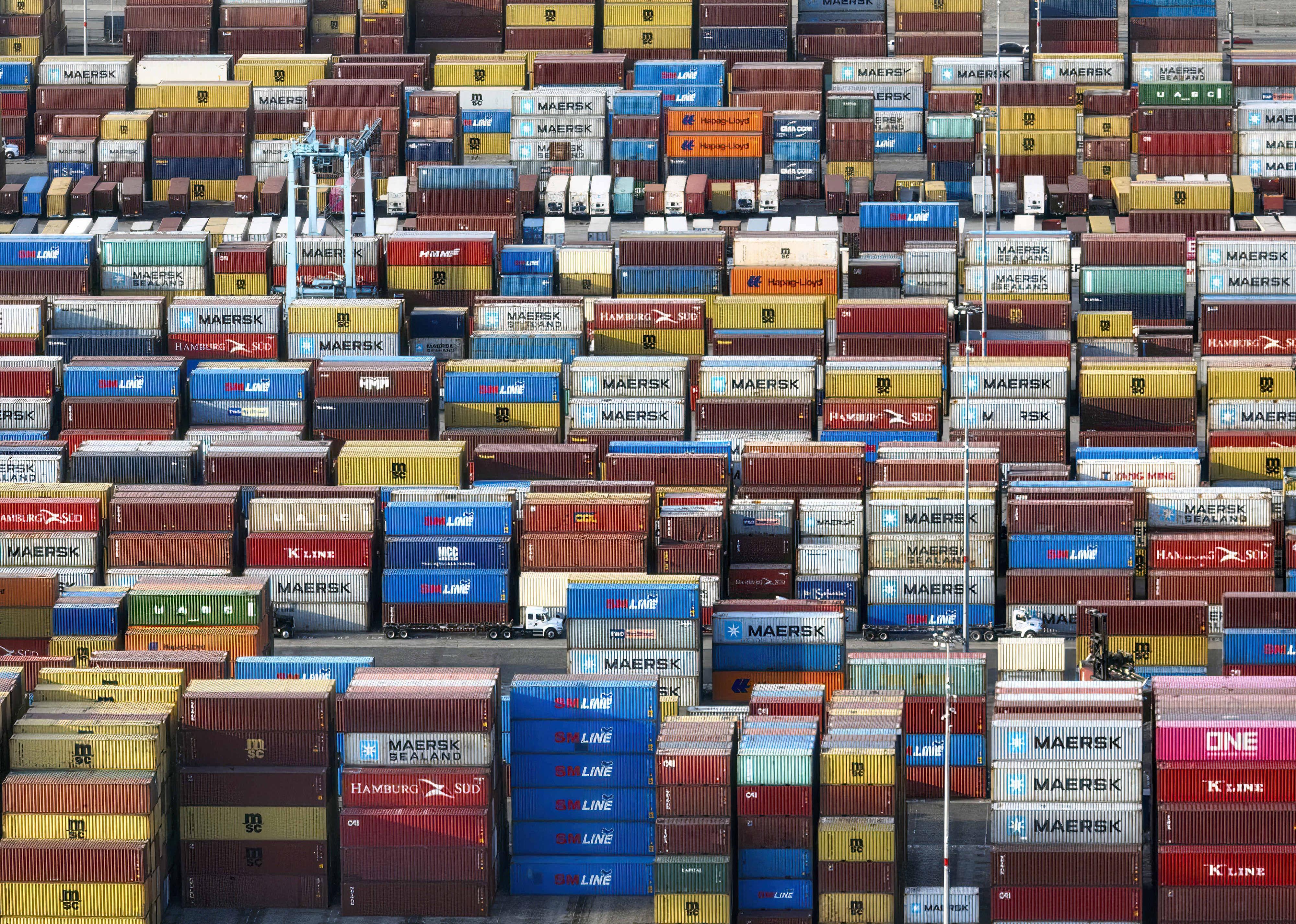 A backlog of containers are stacked at a port.