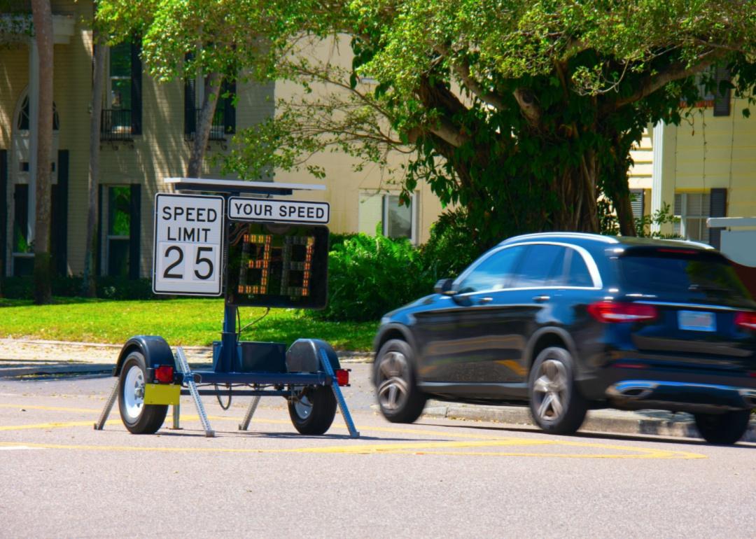 A radar detector shows a passing car’s speed limit as it speeds down the road.