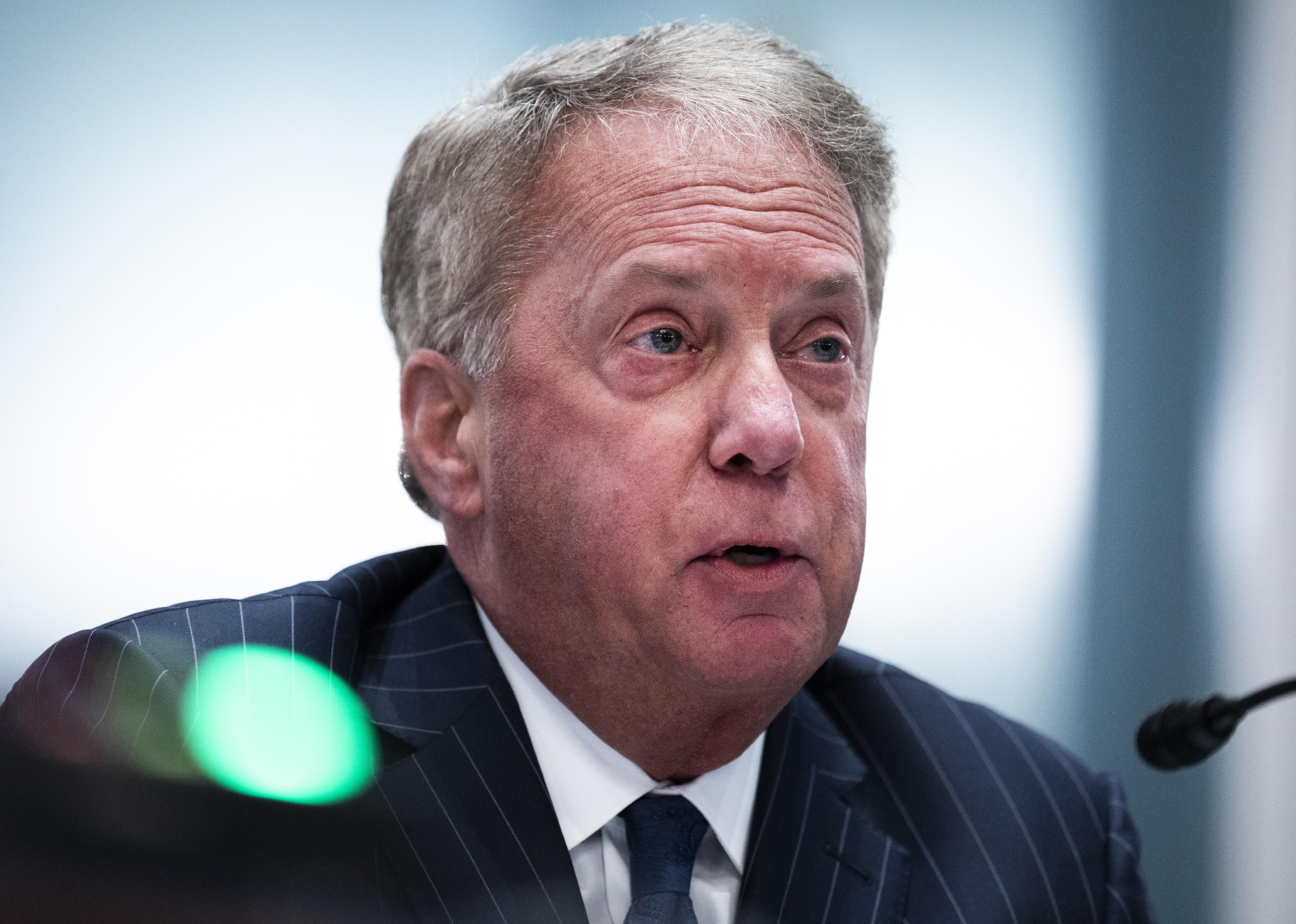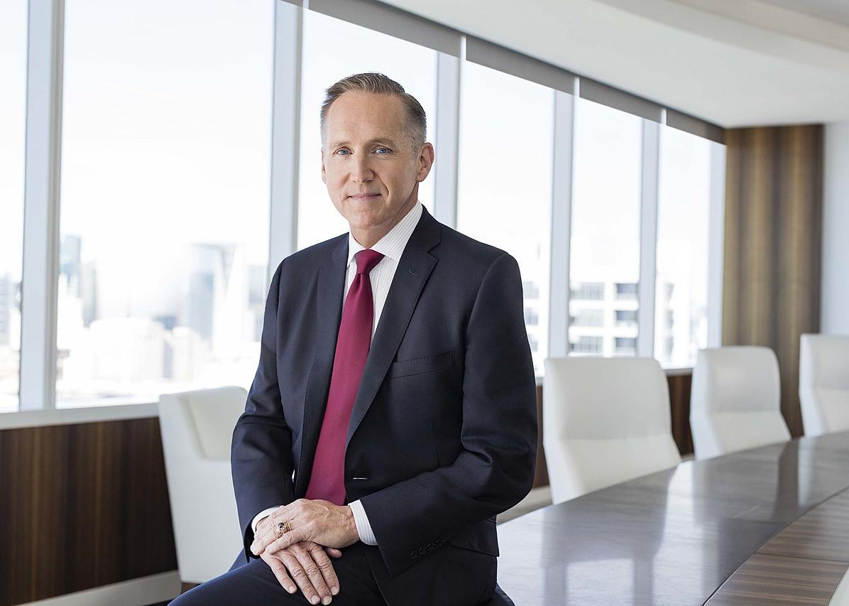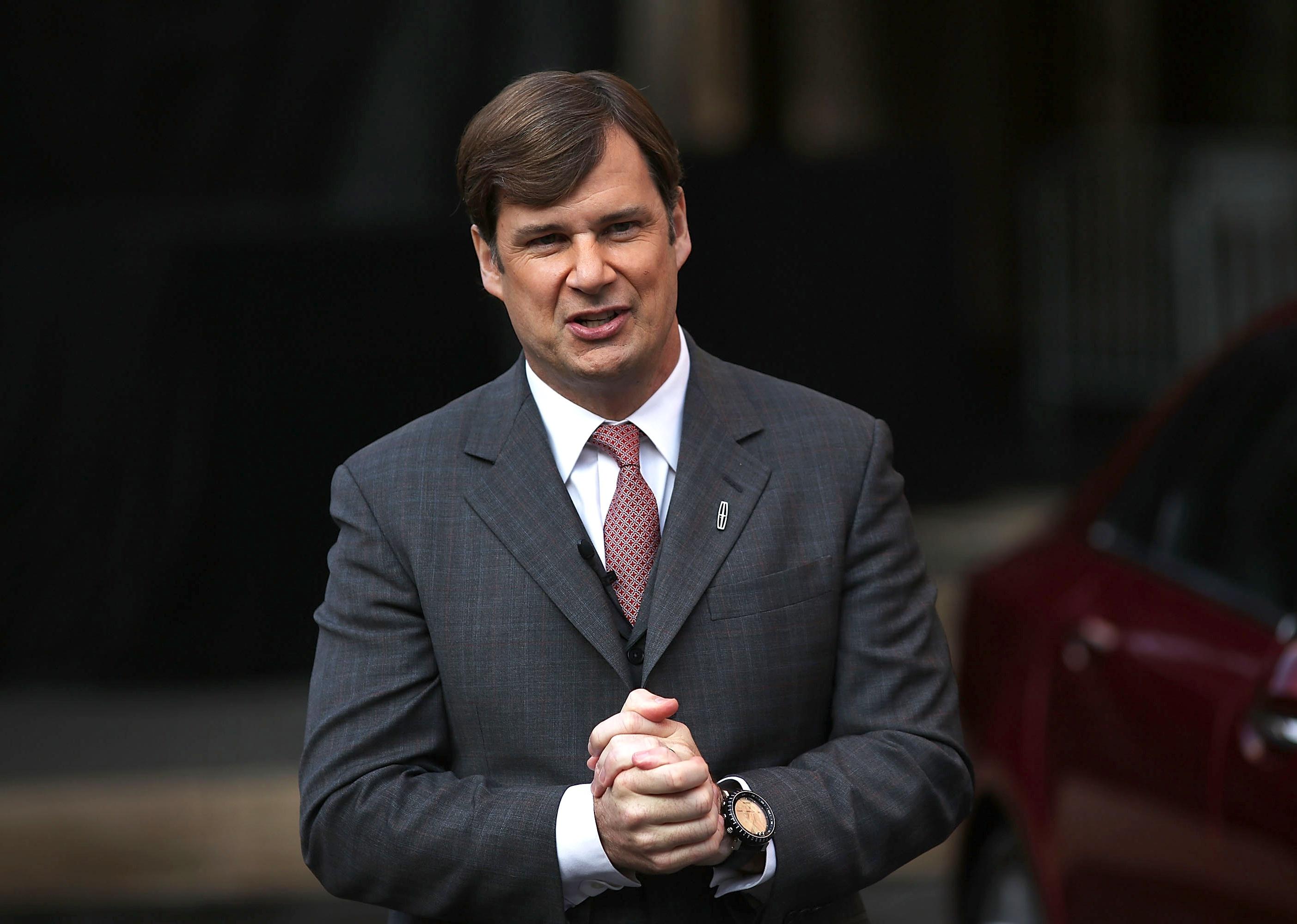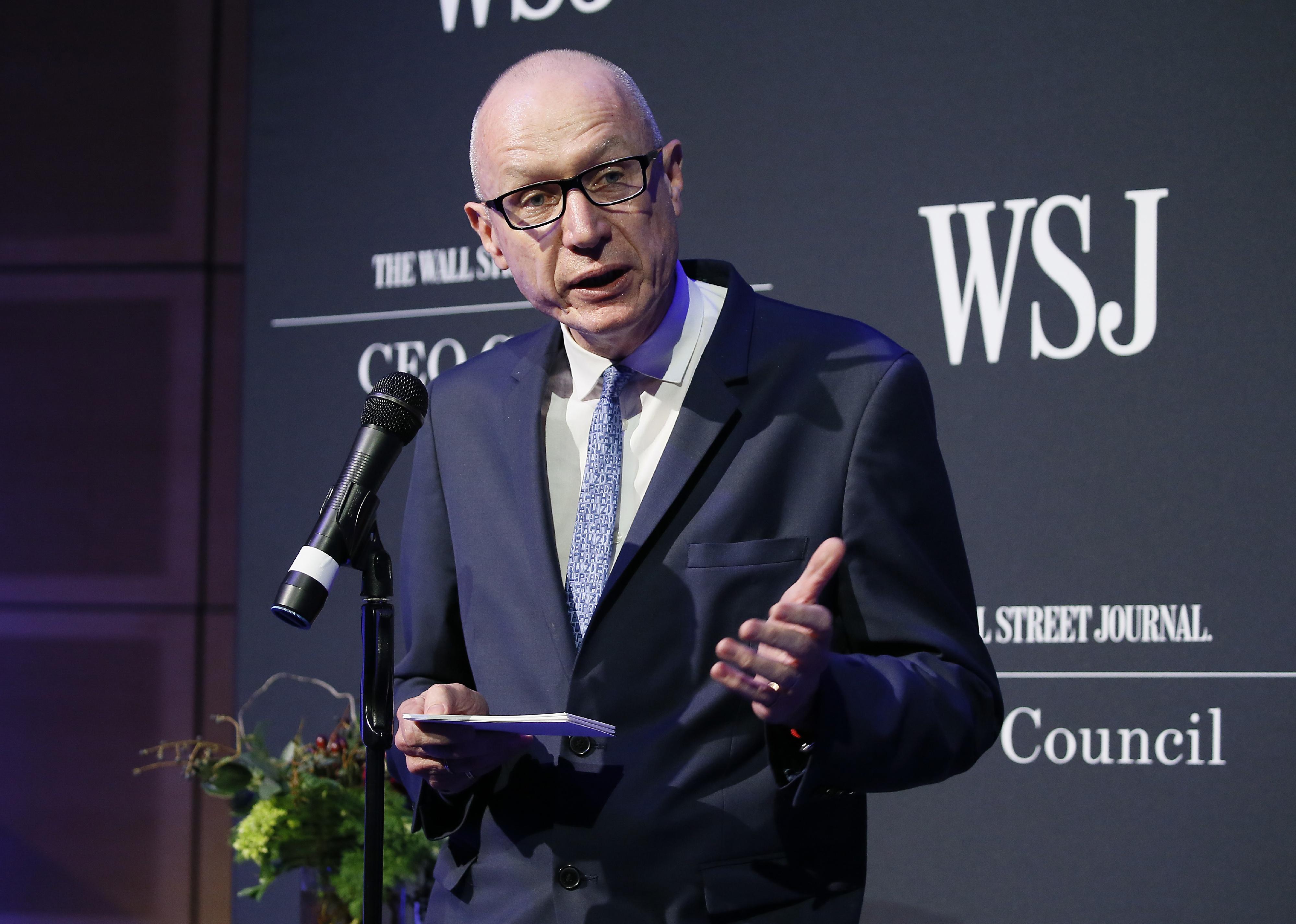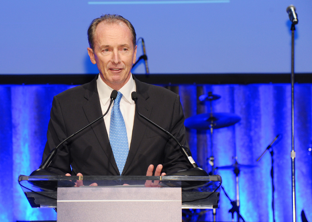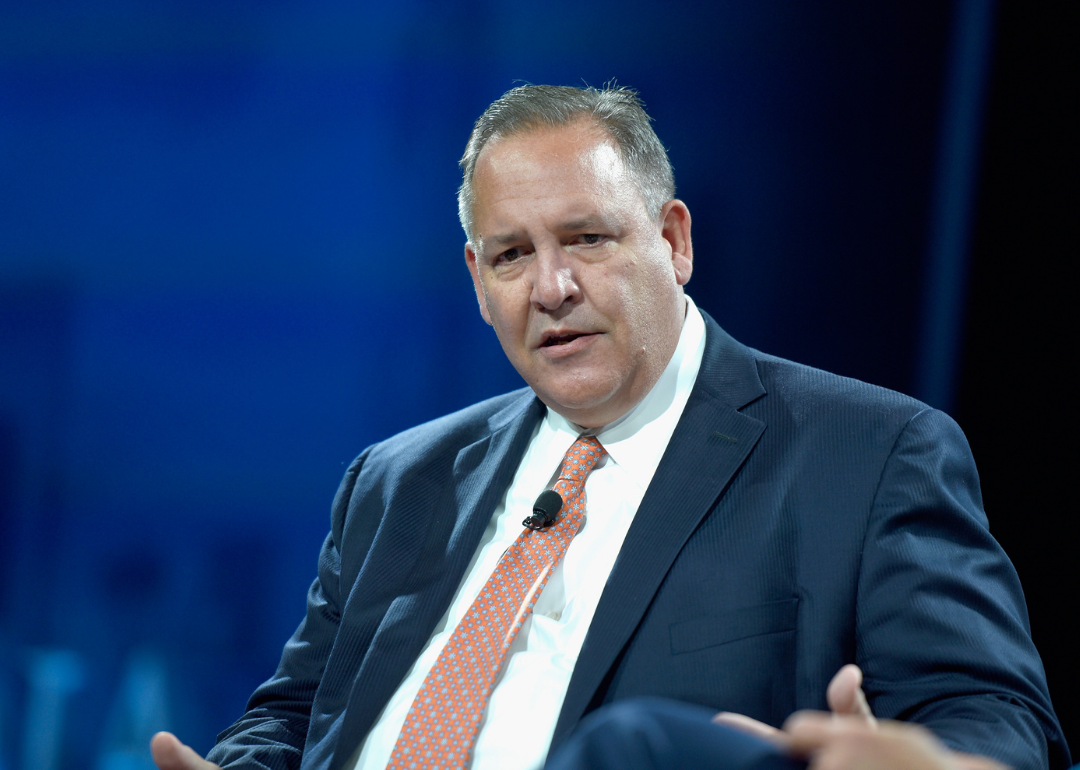 Peter Zaffino sitting at a table with a microphone a a press conference.