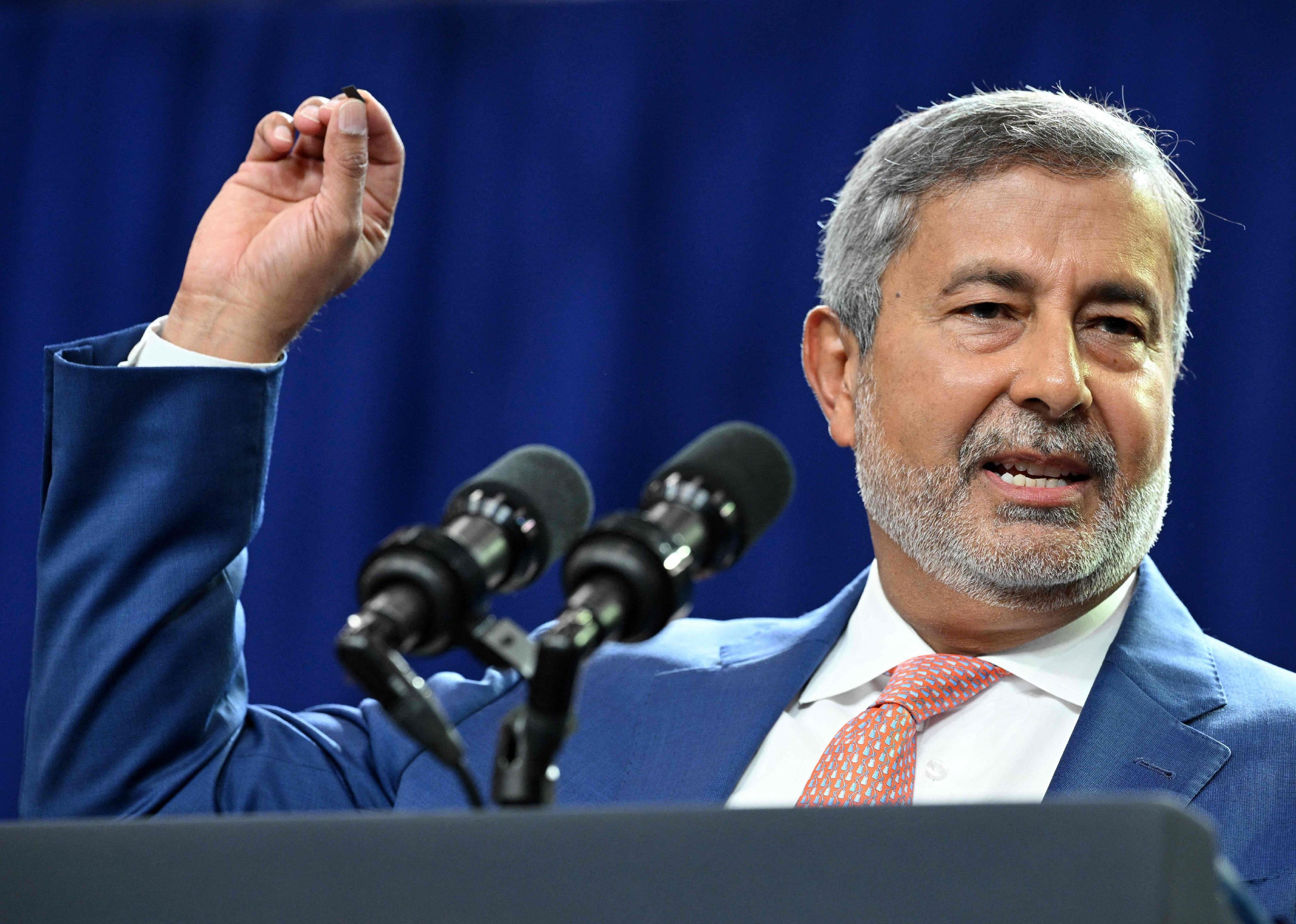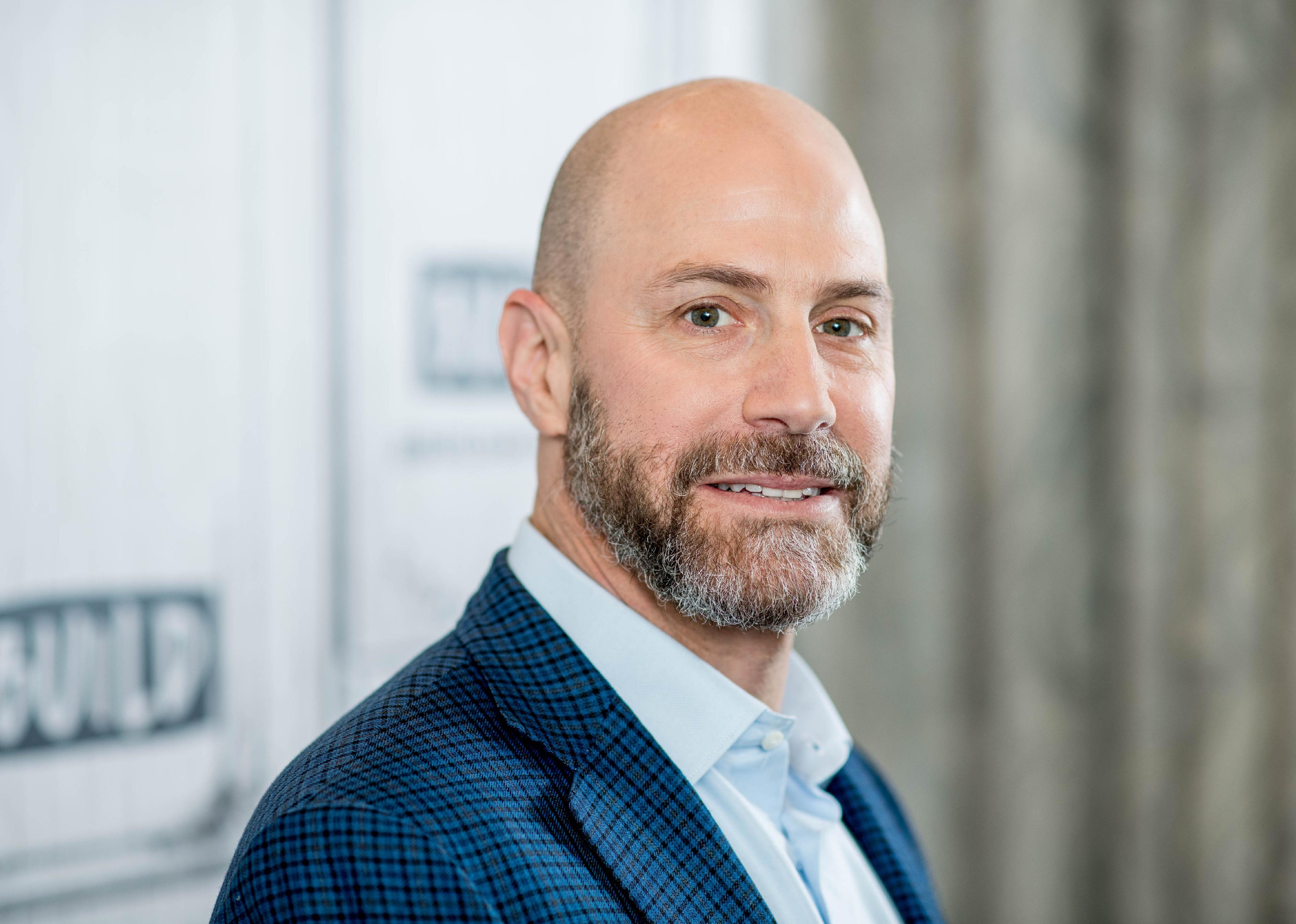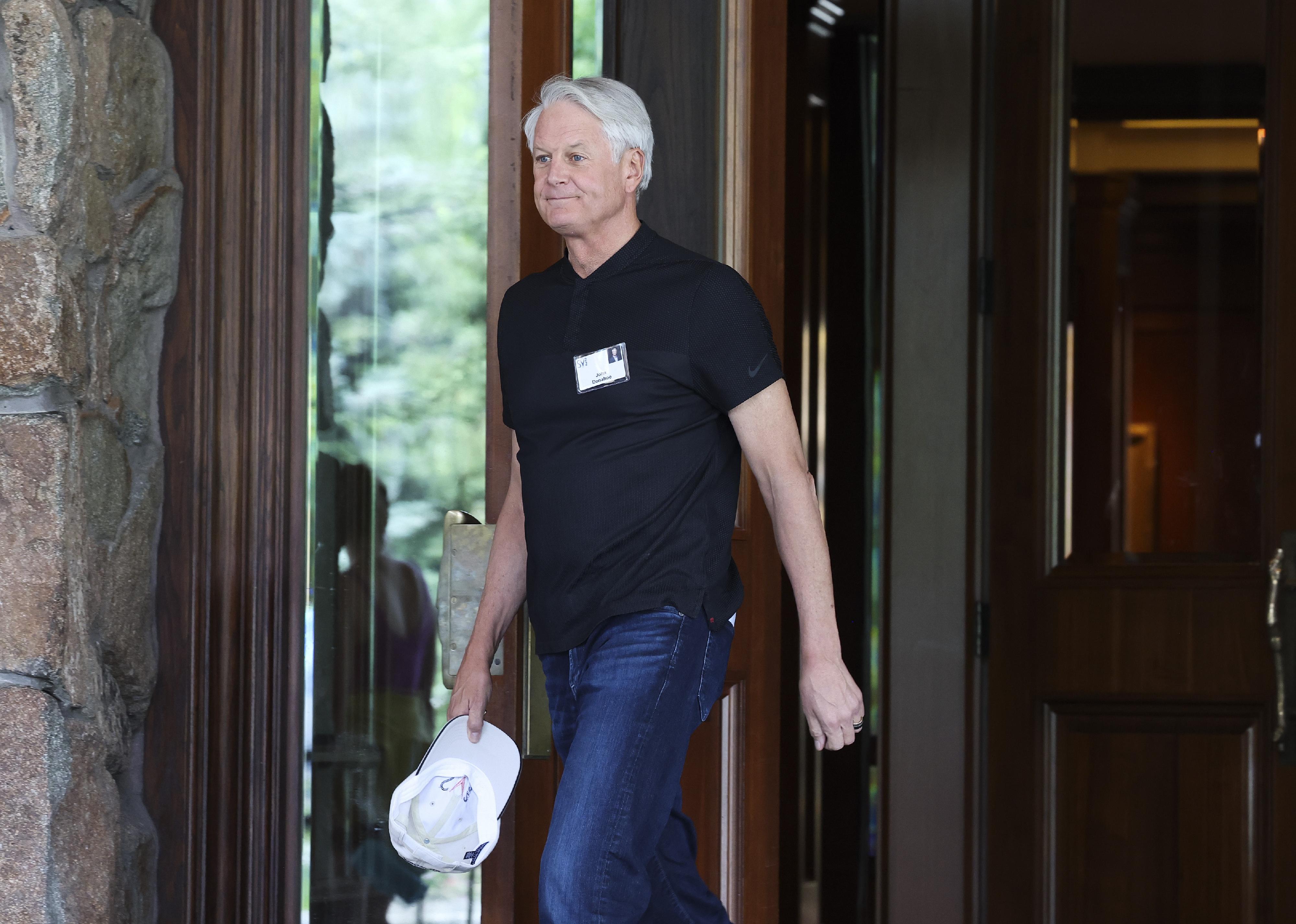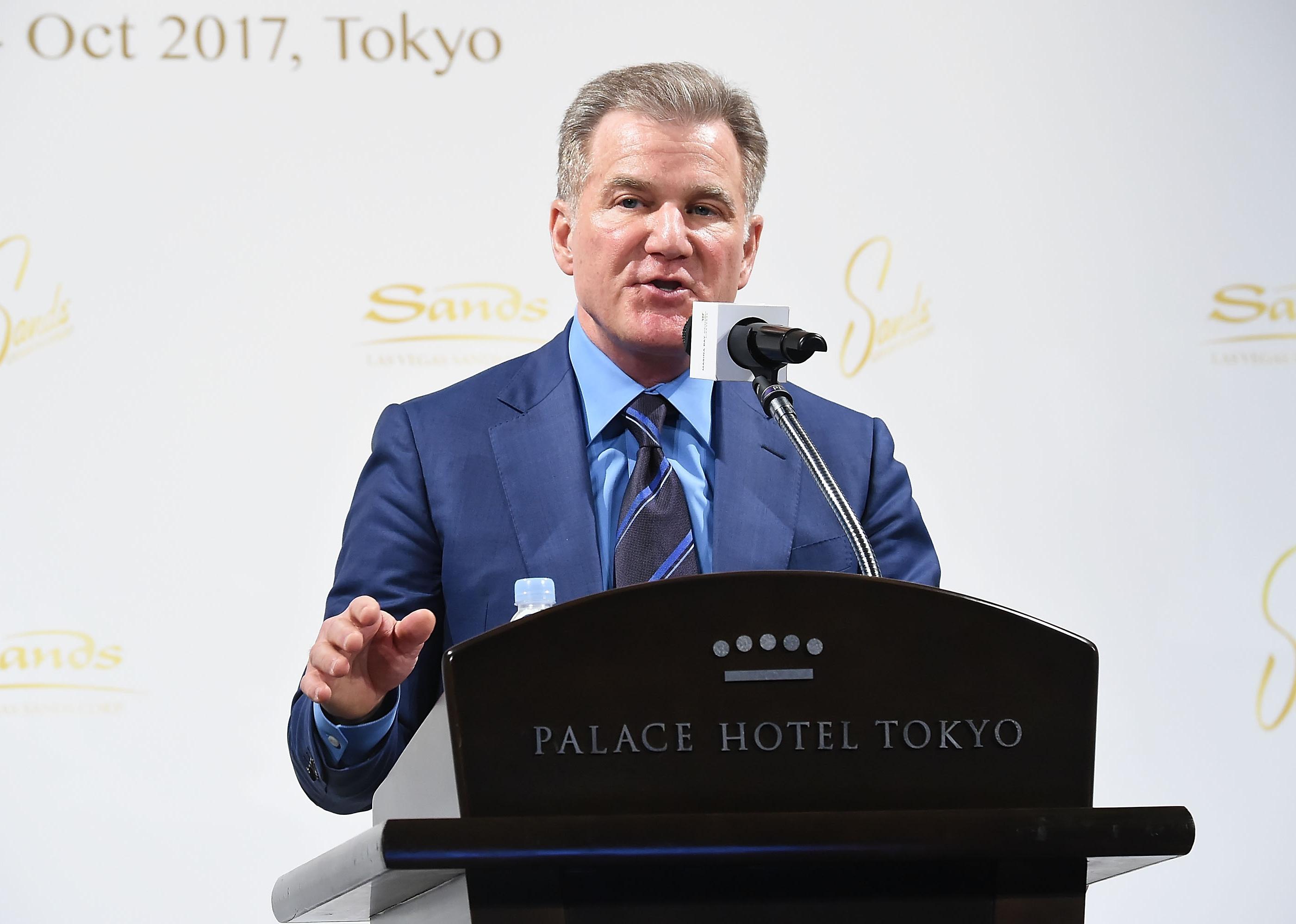 Peter Zaffino sitting at a table with a microphone a a press conference.
