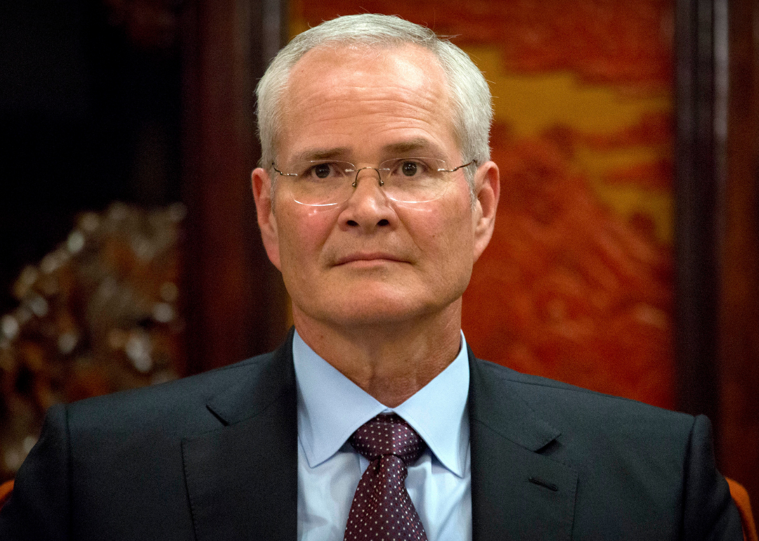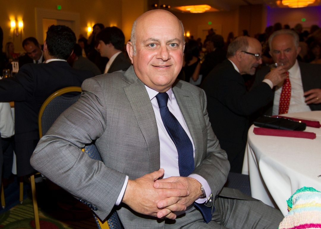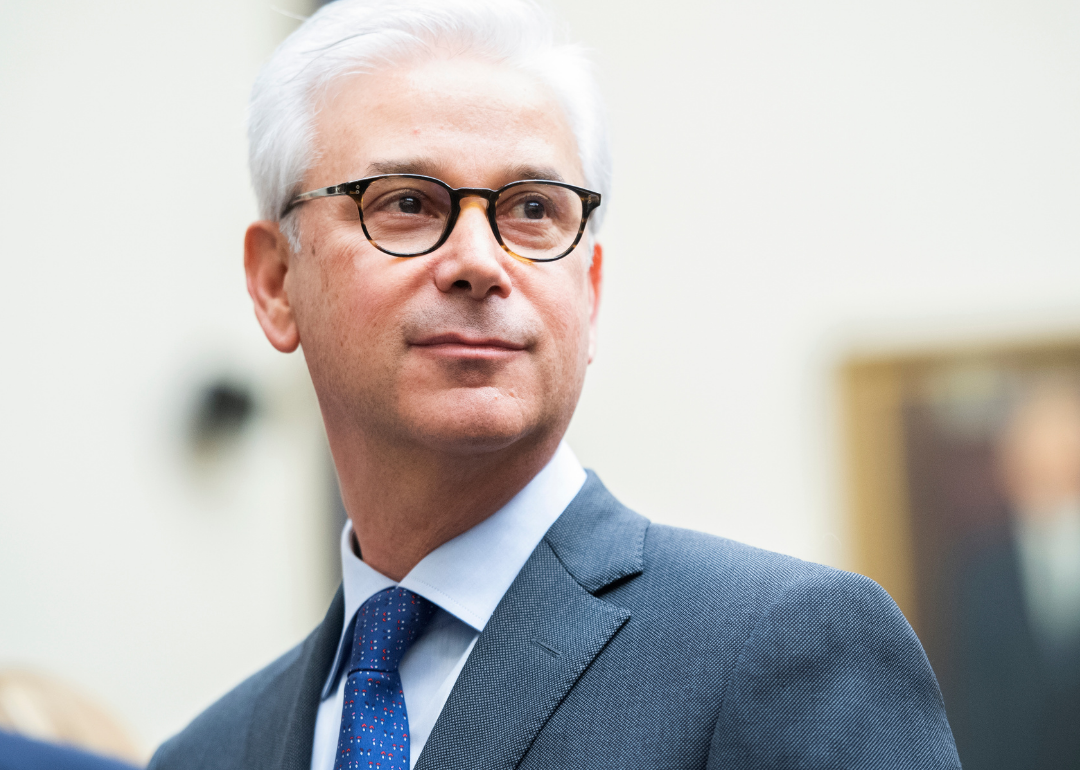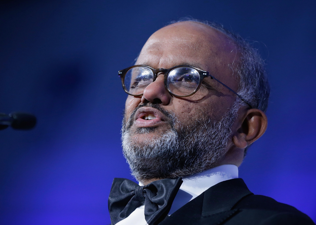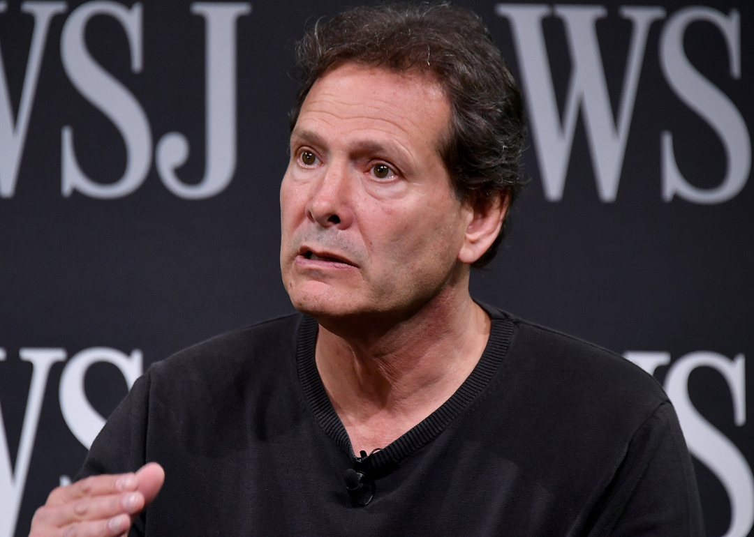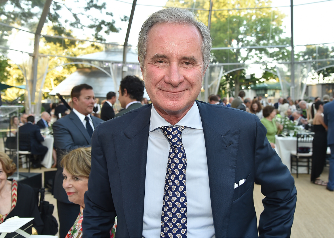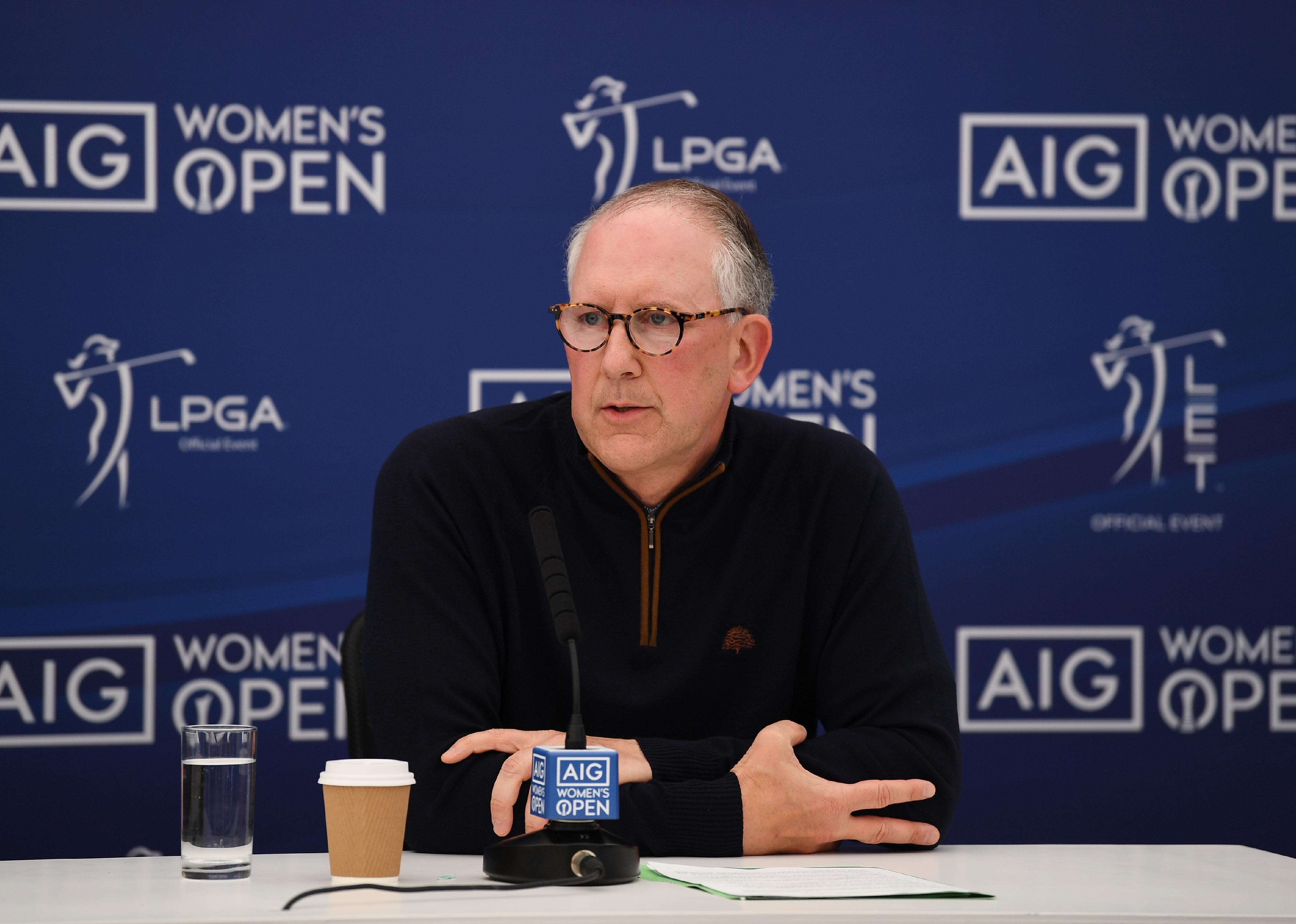 Peter Zaffino sitting at a table with a microphone a a press conference.