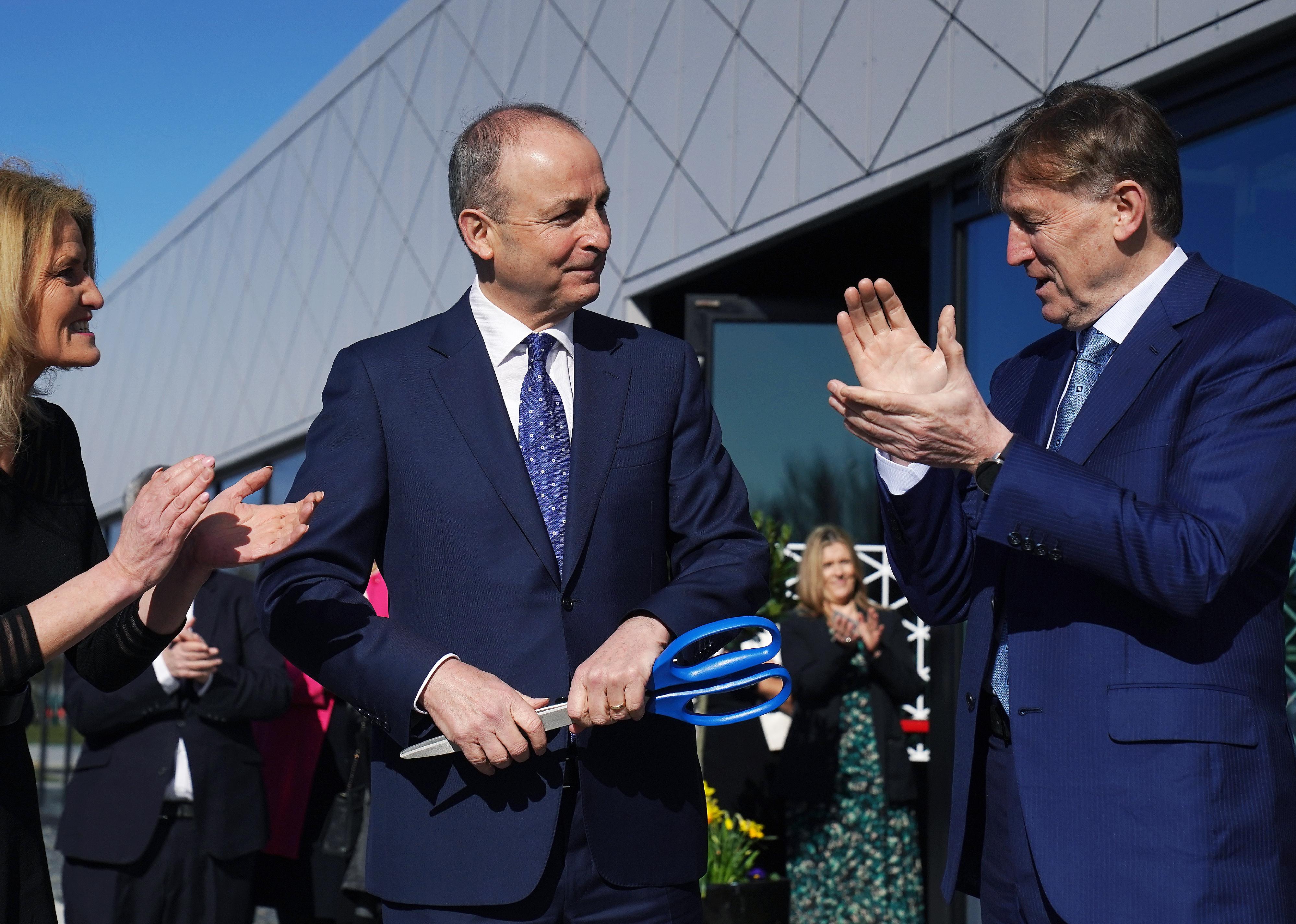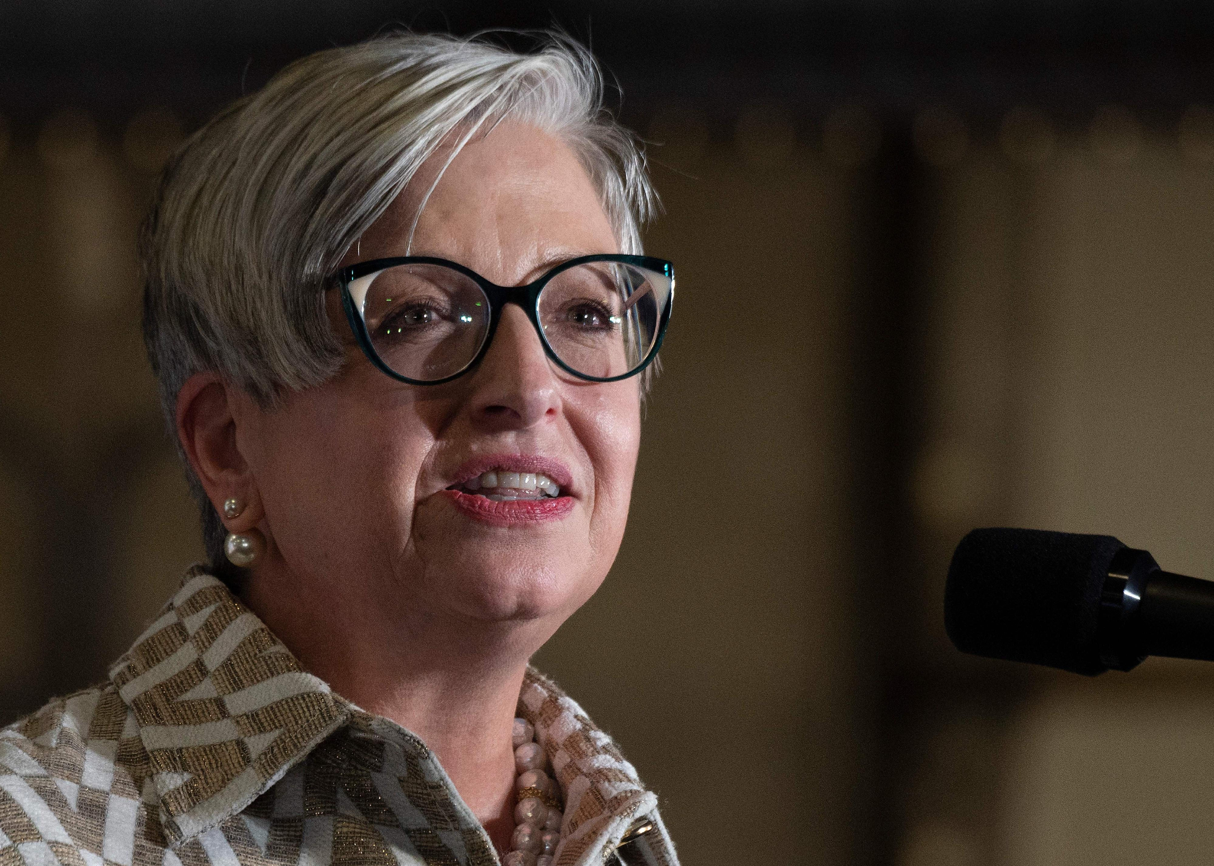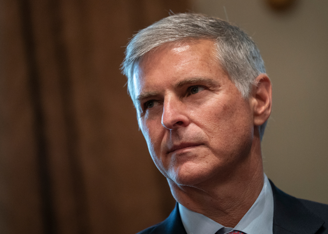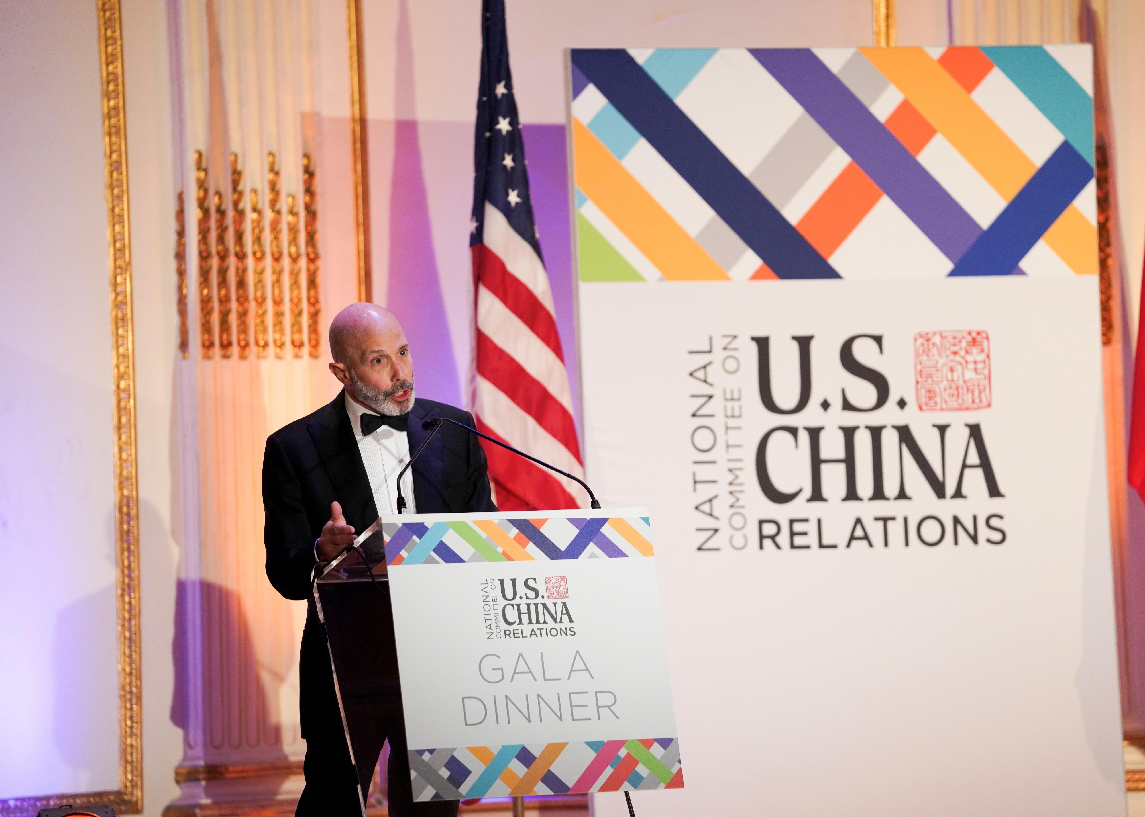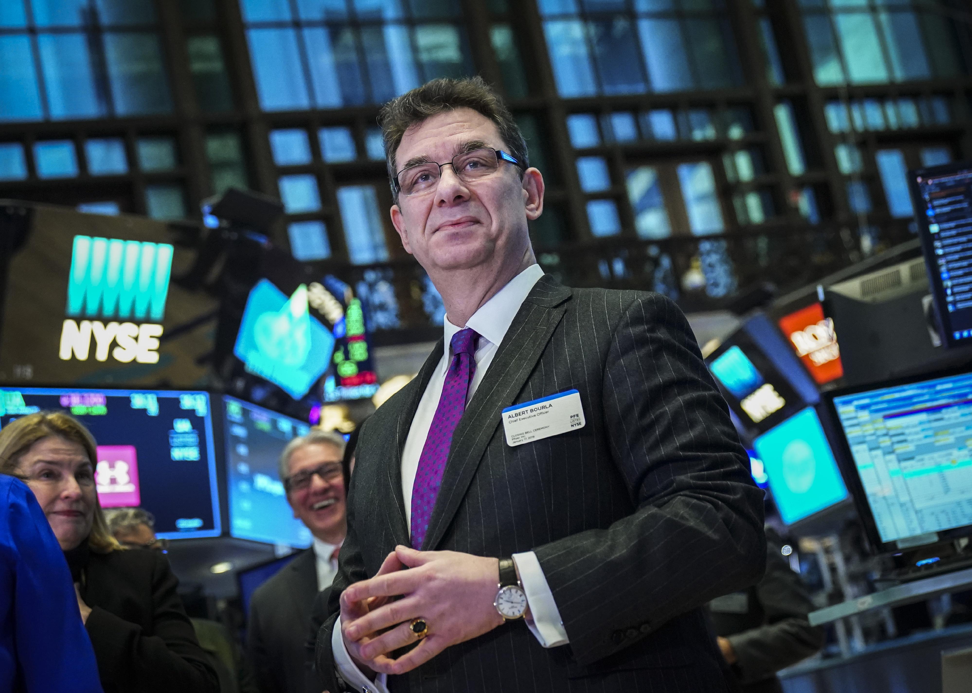 Peter Zaffino sitting at a table with a microphone a a press conference.