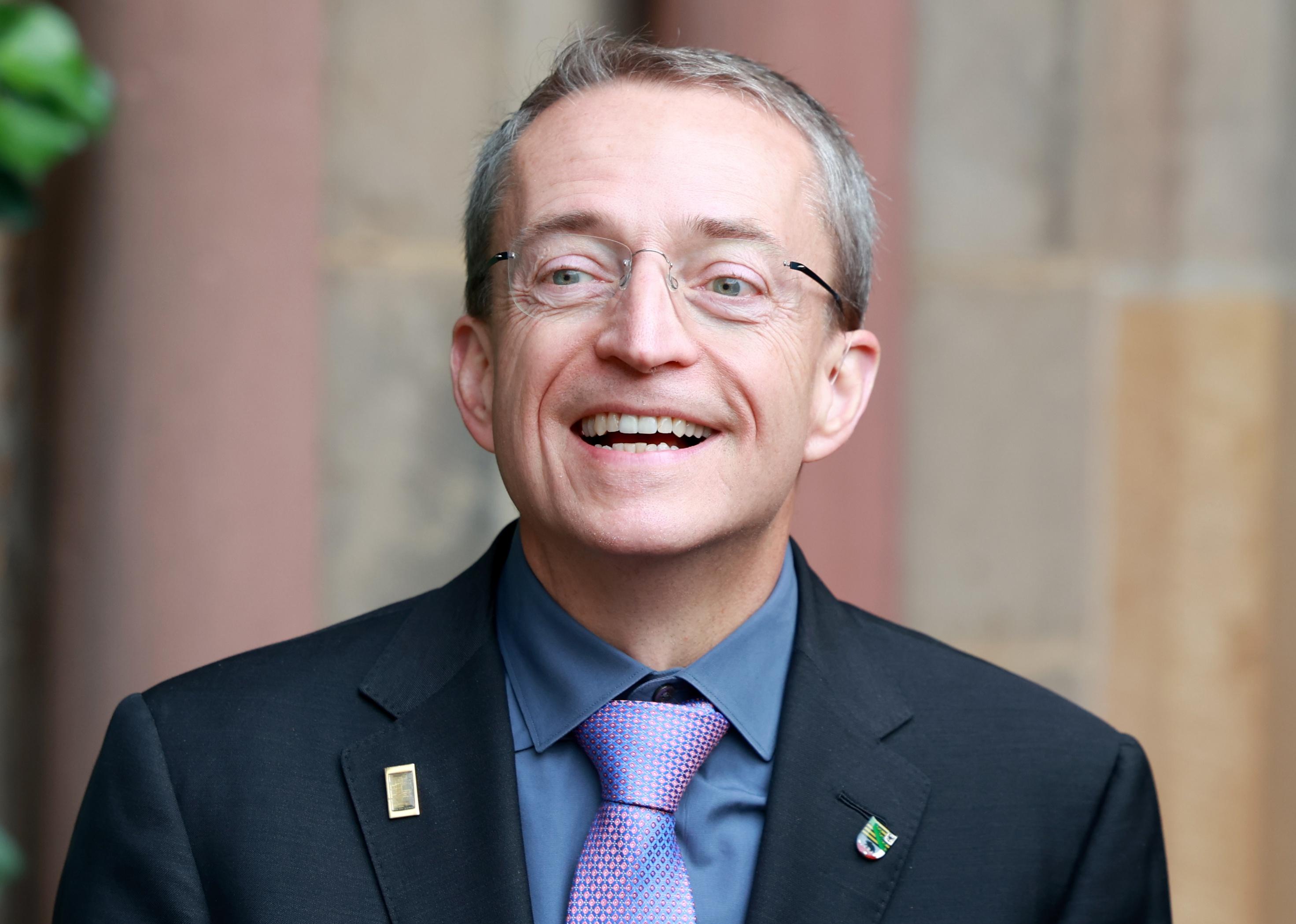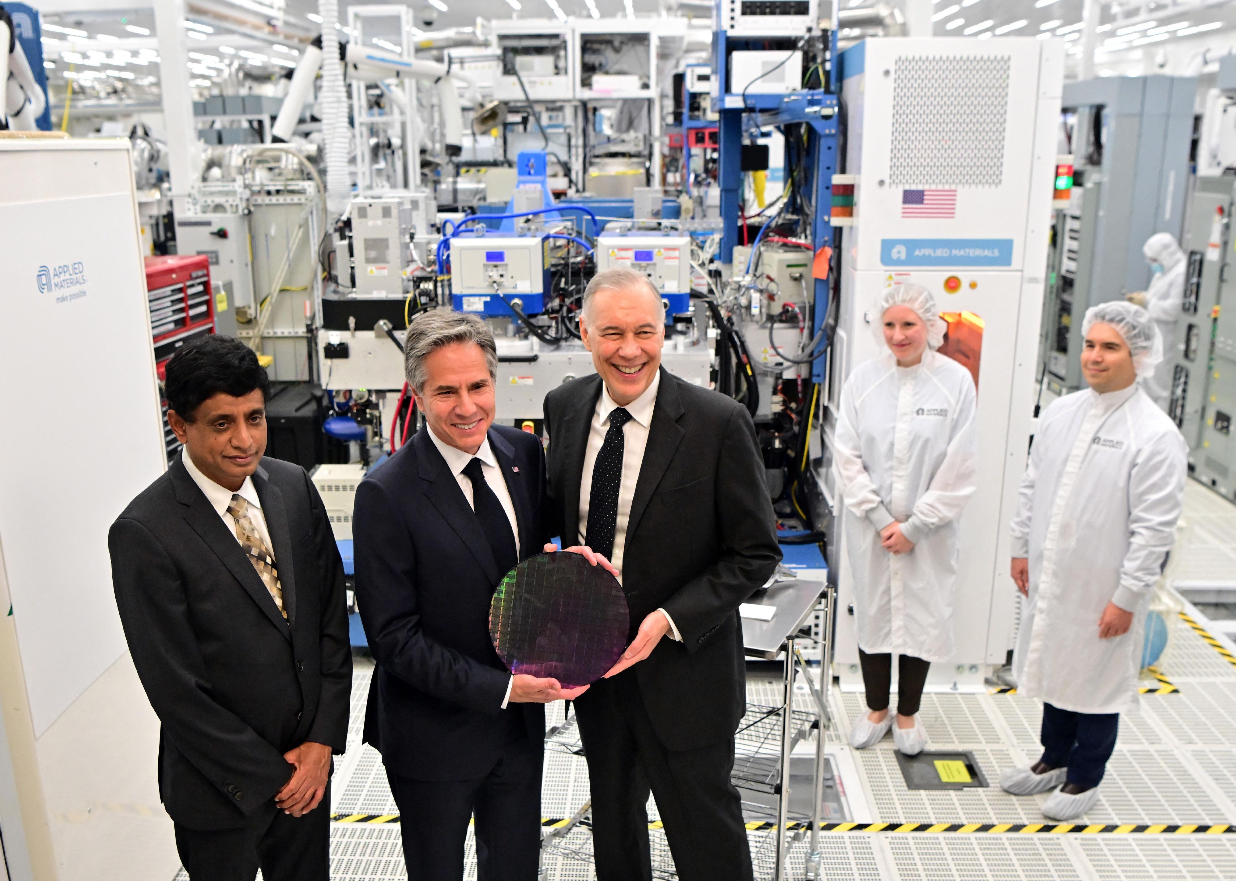 Gary Dickerson with a guest and Applied Materials employees pose for a photo.