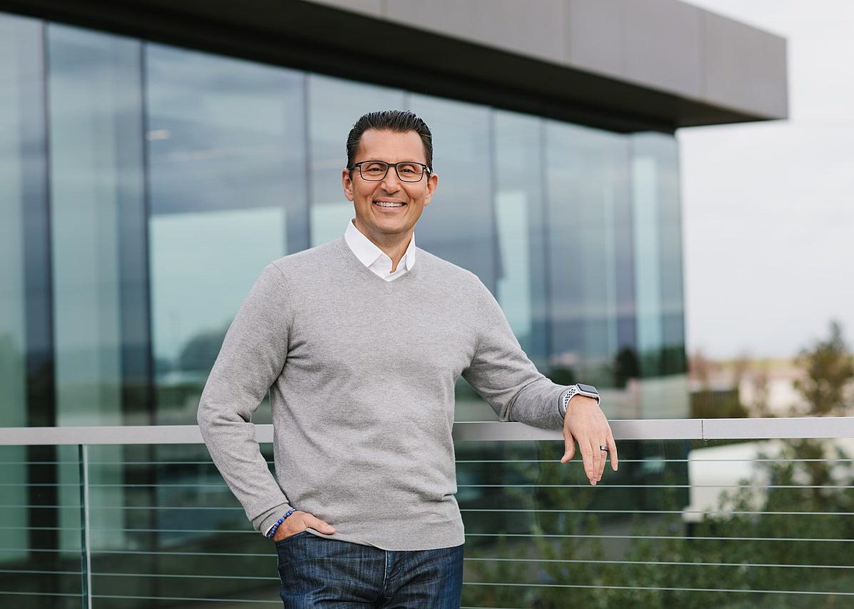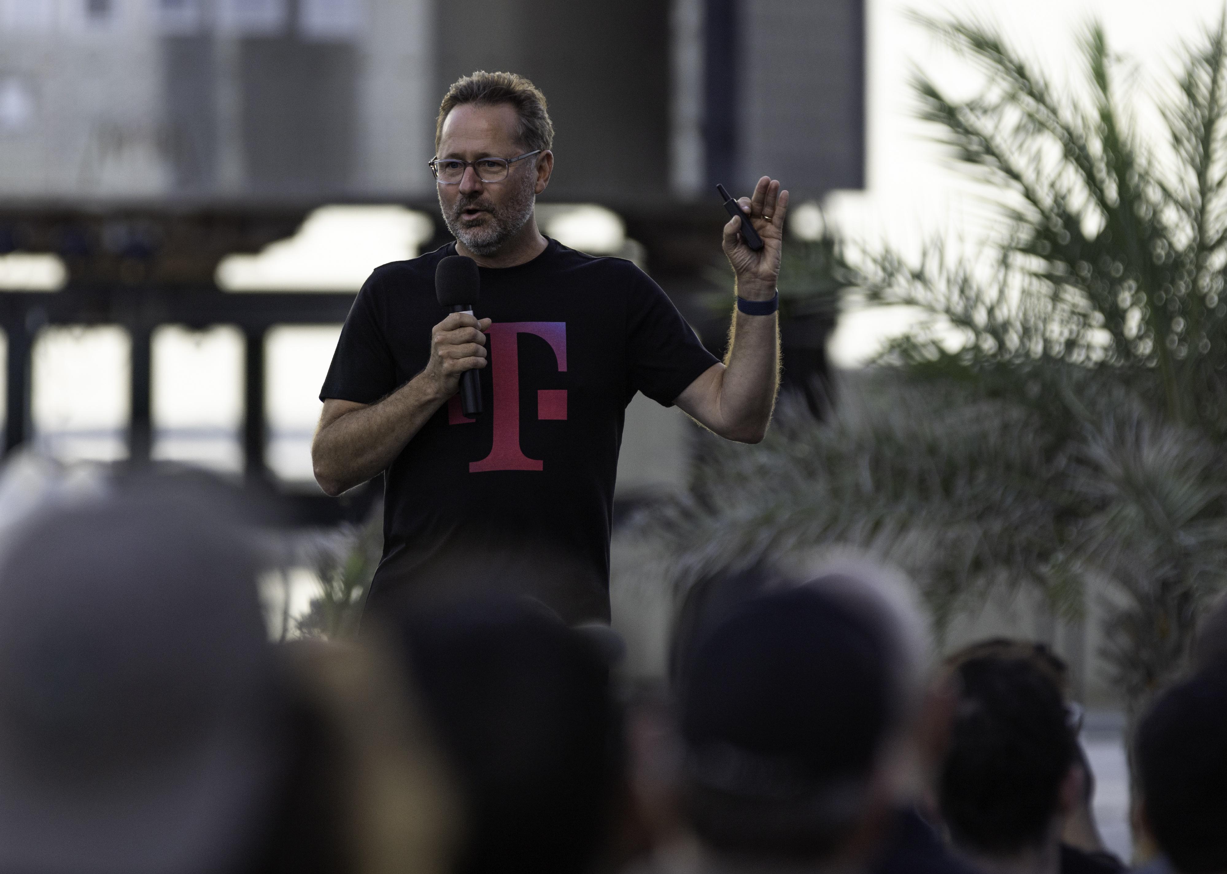 Sievert speaking outdoors wearing a T Mobile t-shirt.