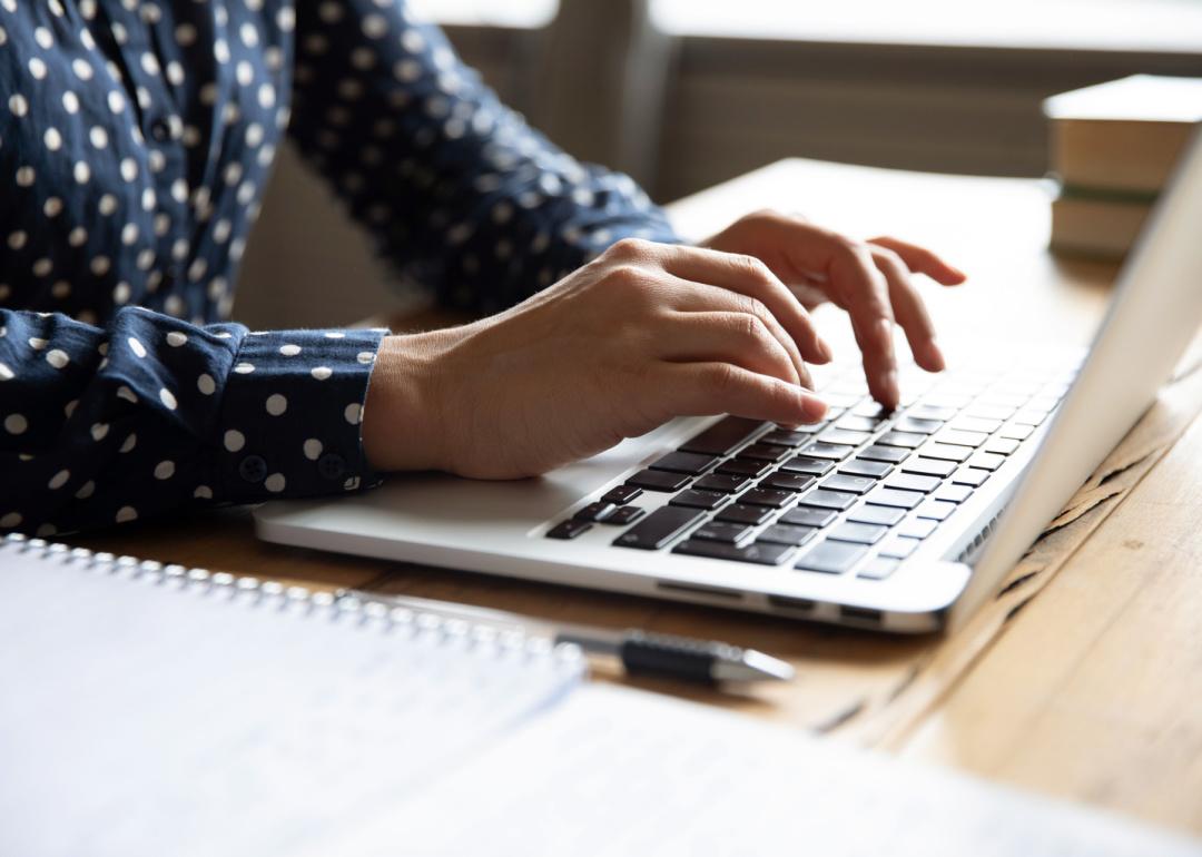 Close up of hands typing on laptop computer.
