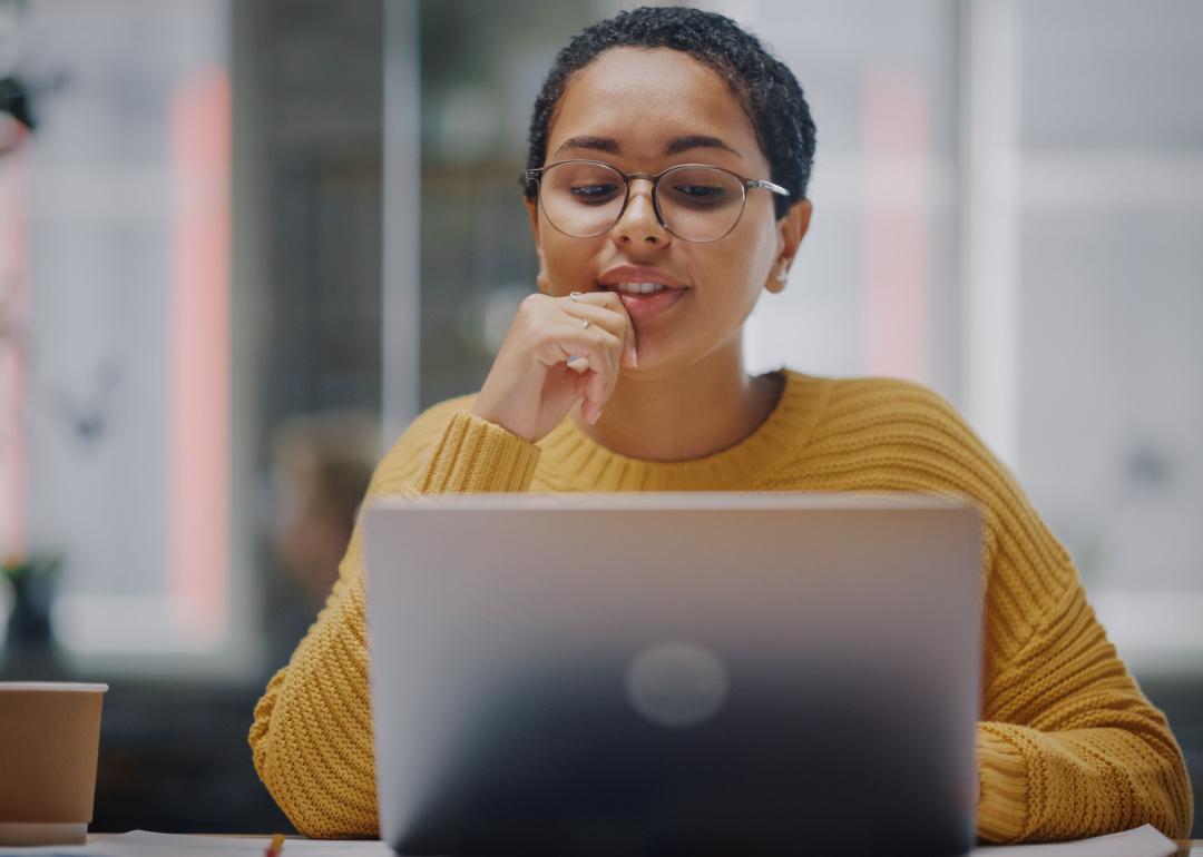 Woman hesitating before answering email to colleague.