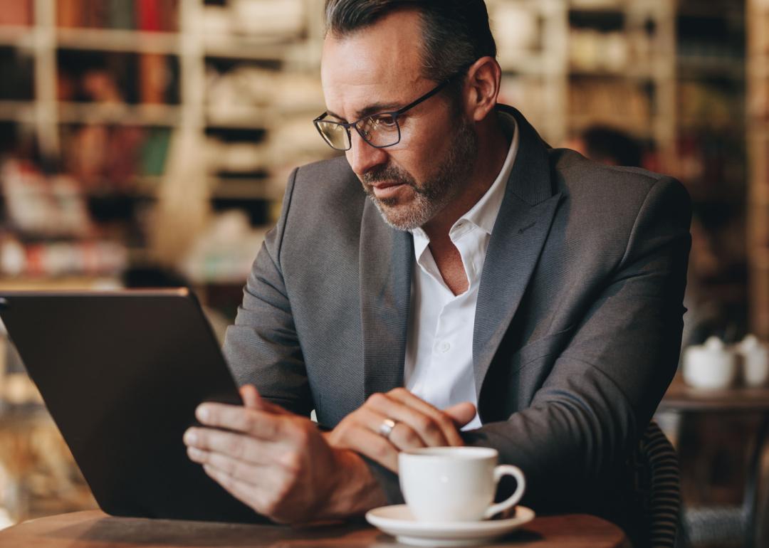 Man reading email on tablet in cafe.