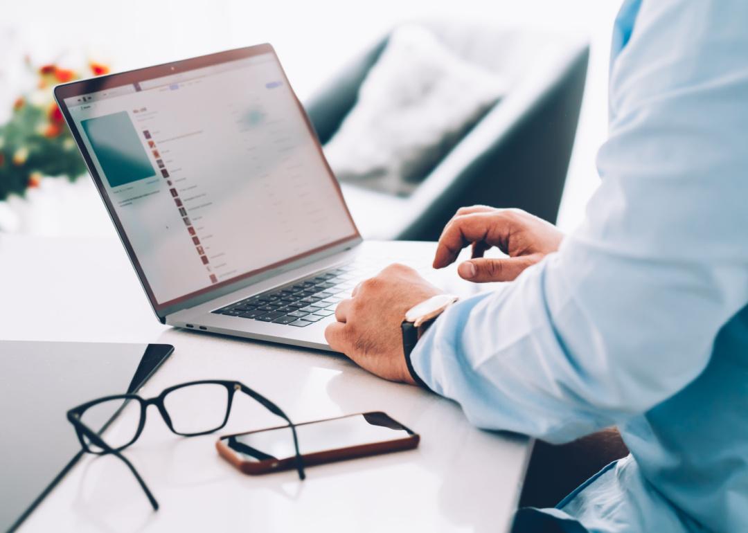 Person composing email on laptop computer in office.