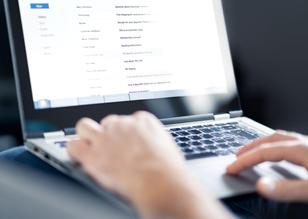 Close view of laptop screen with email inbox open and someone typing.