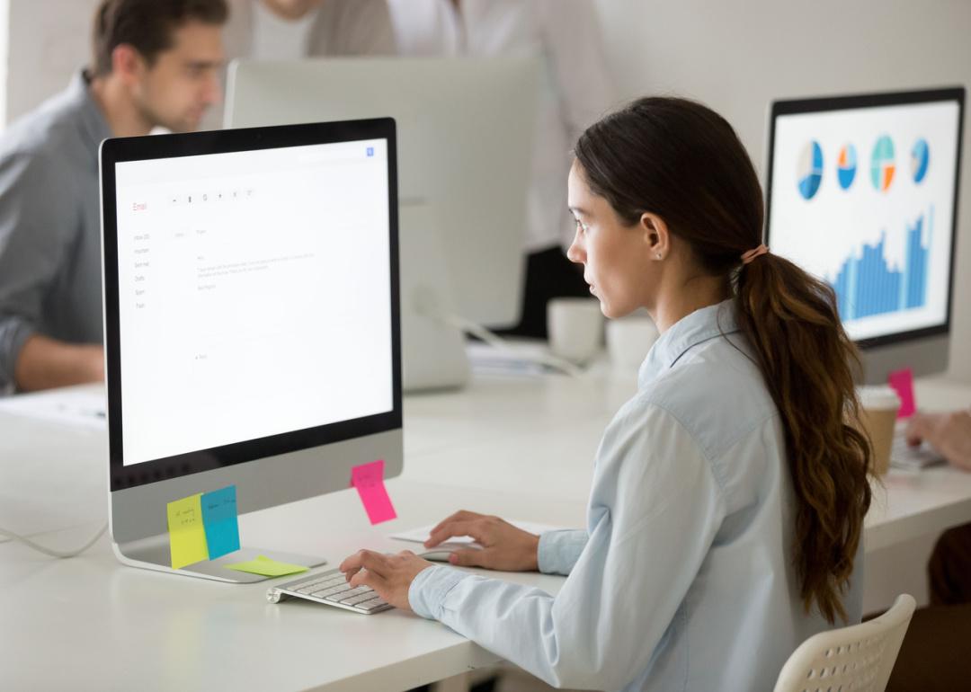 Woman in office composing email.