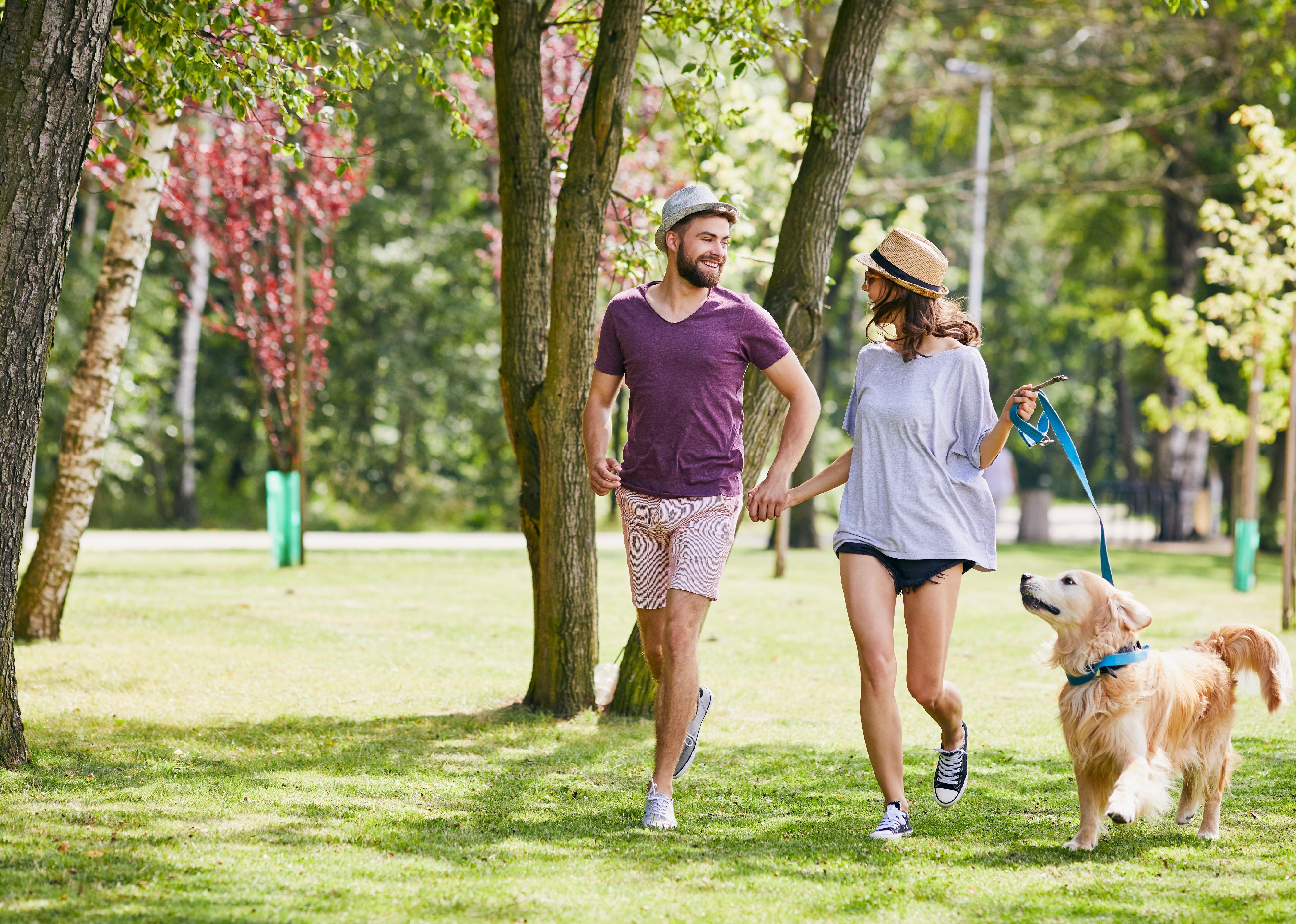 Young couple running in the park with their dog.