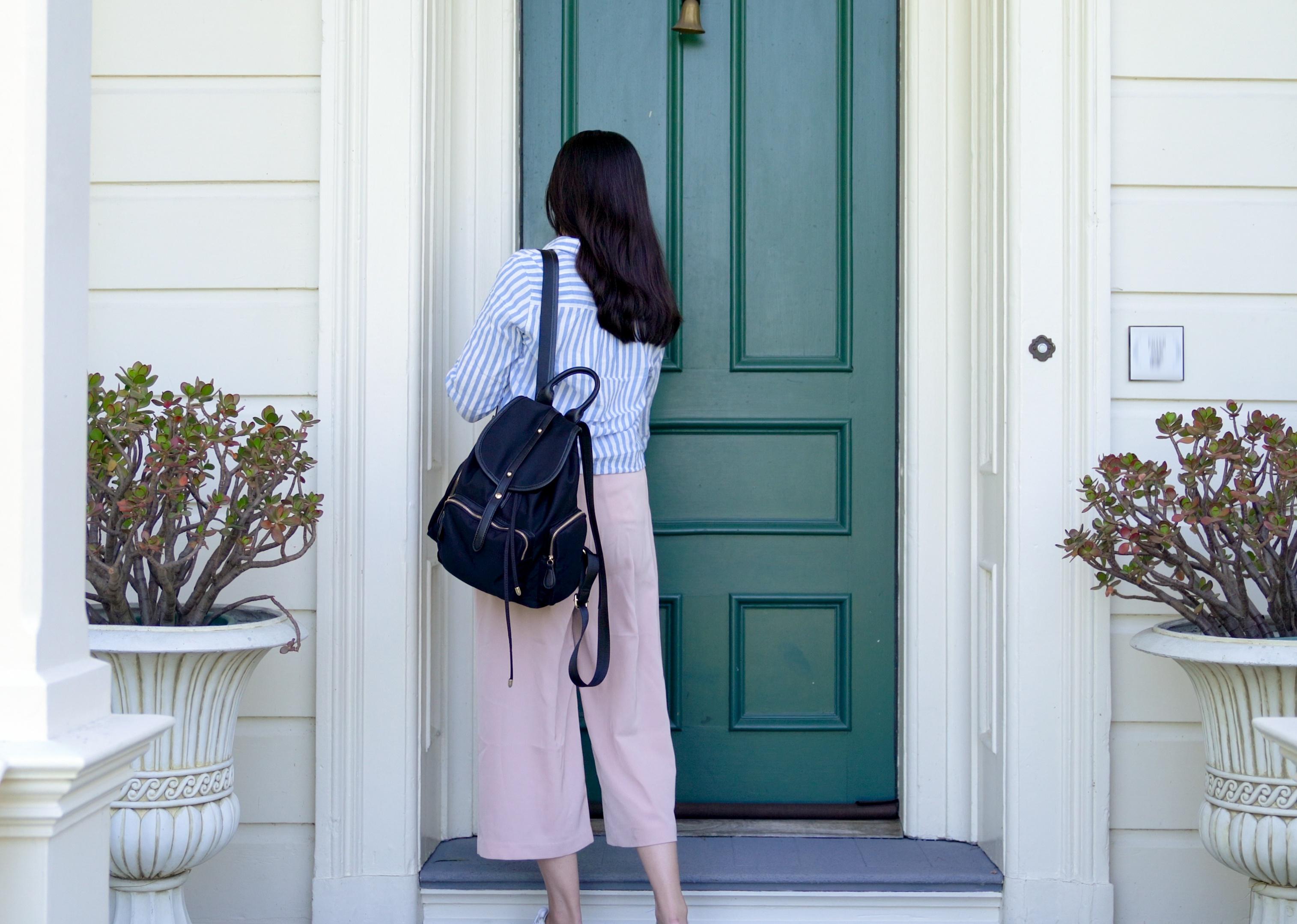 Back view of a woman using a key to open front door.