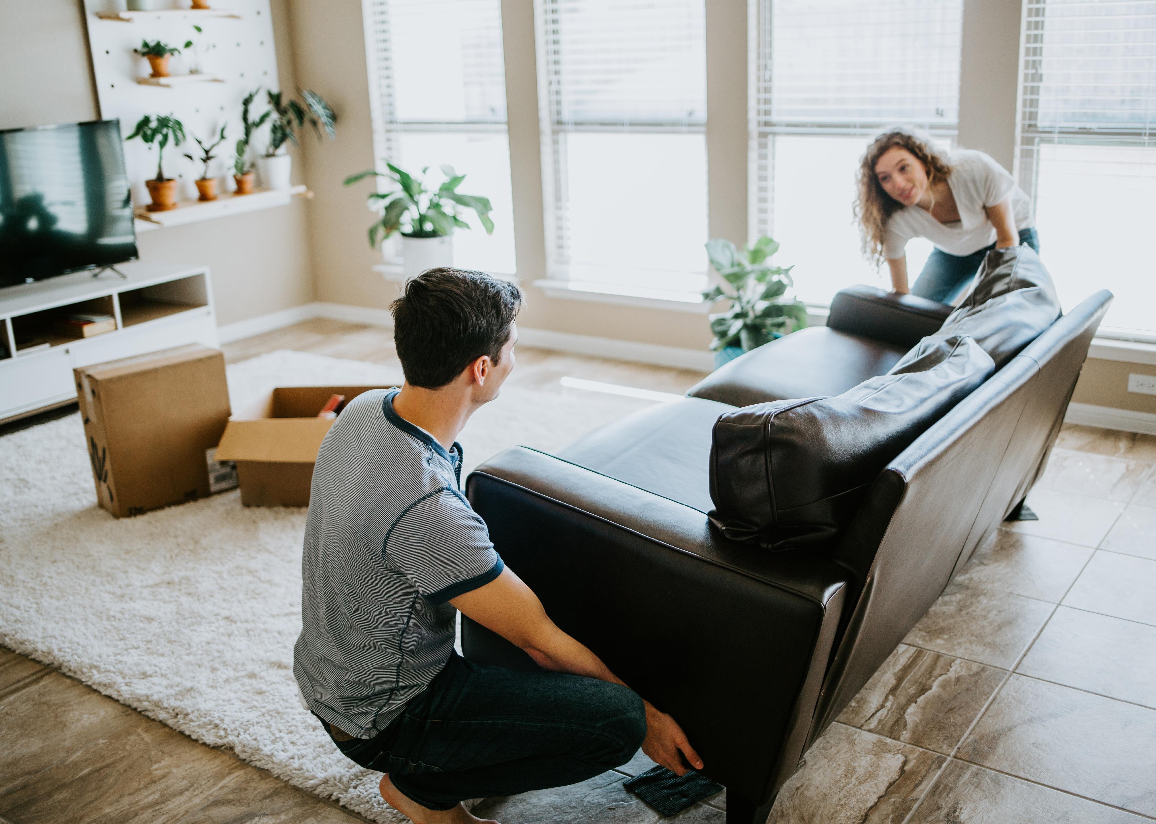 Young couple moving a couch inside.