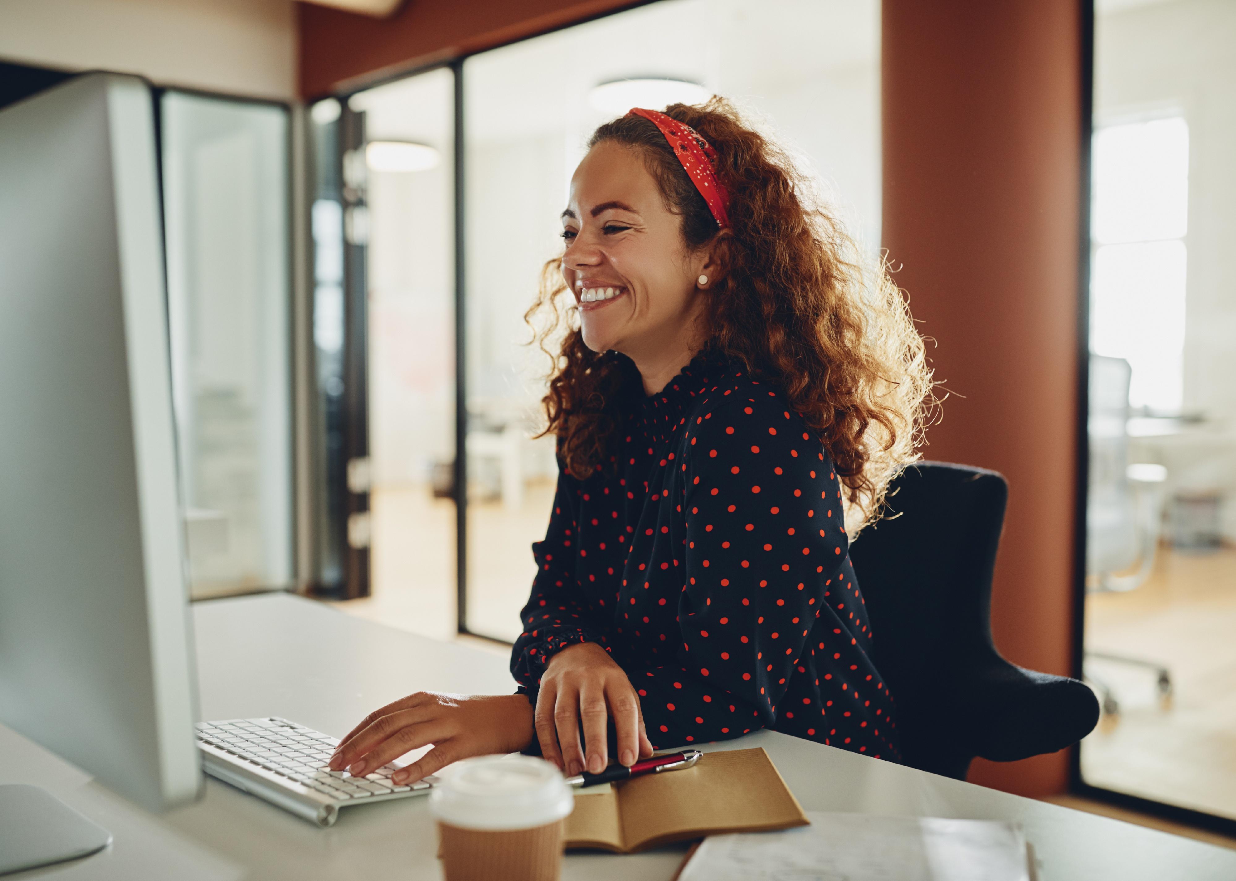Young sitting at a desk and laughingwhile working on a computer.