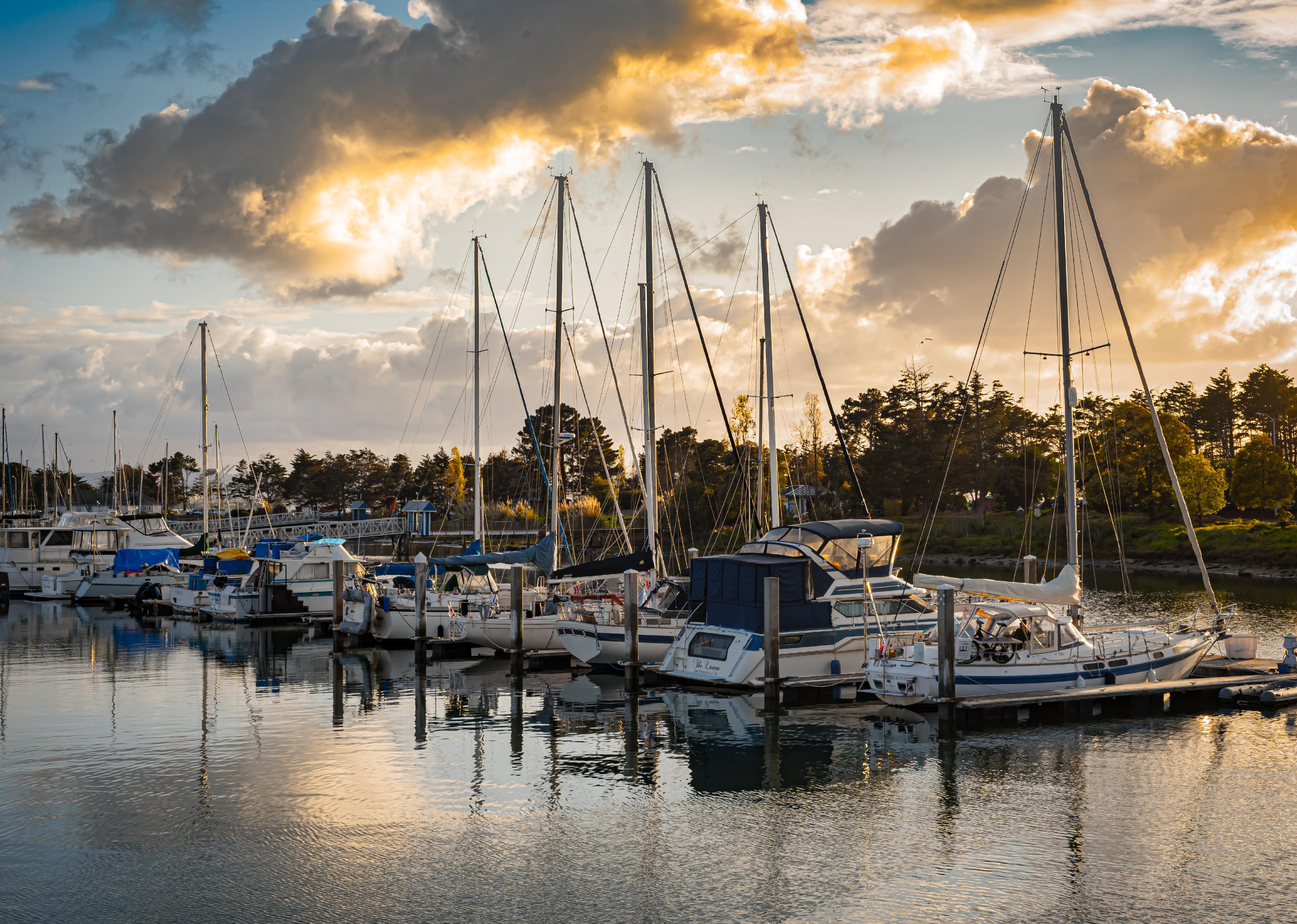 Emeryville Marina before sunset, with dramatic clouds.