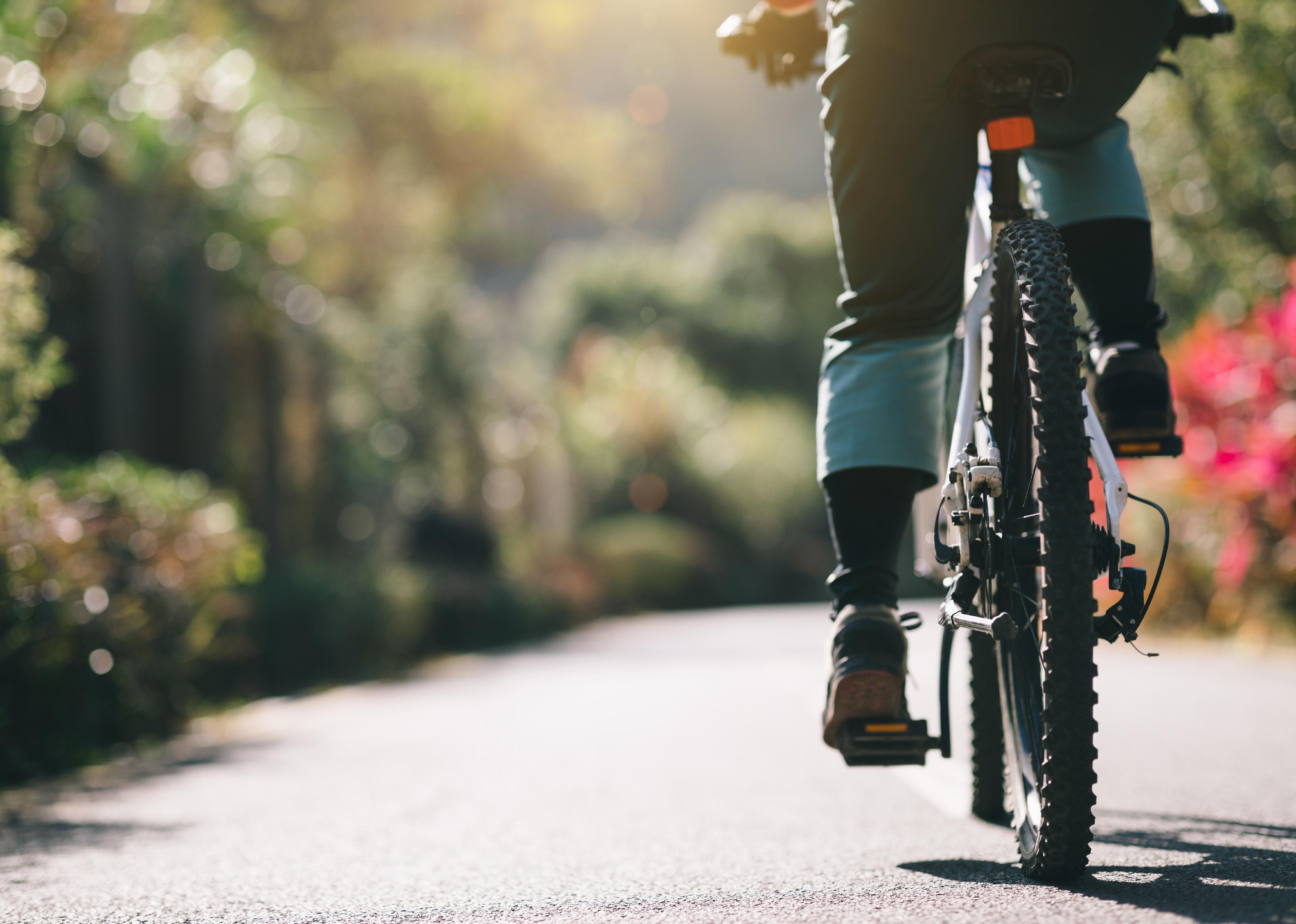 Woman riding a bike on a park trail.