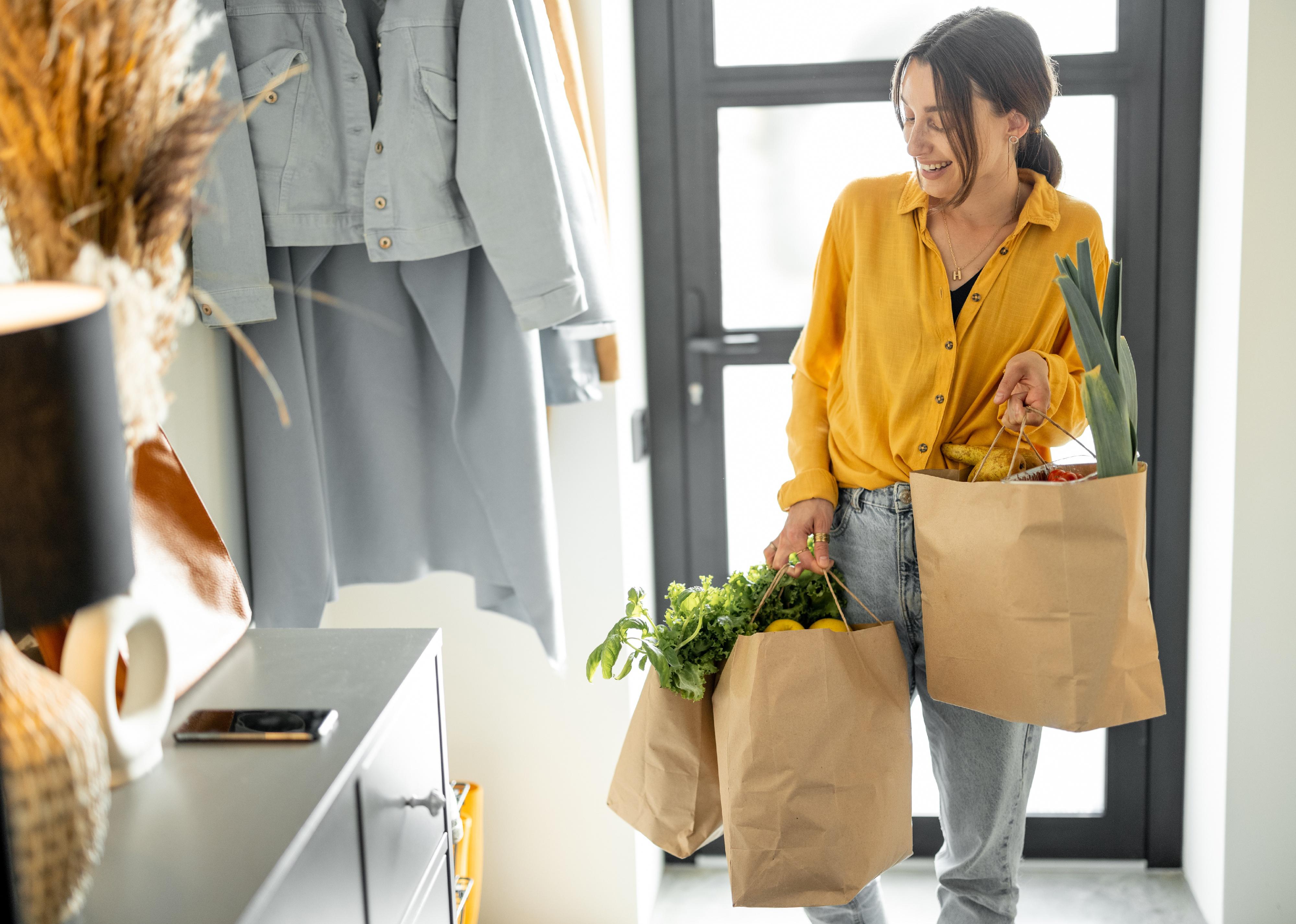 Woman coming home with bags full of fresh groceries.