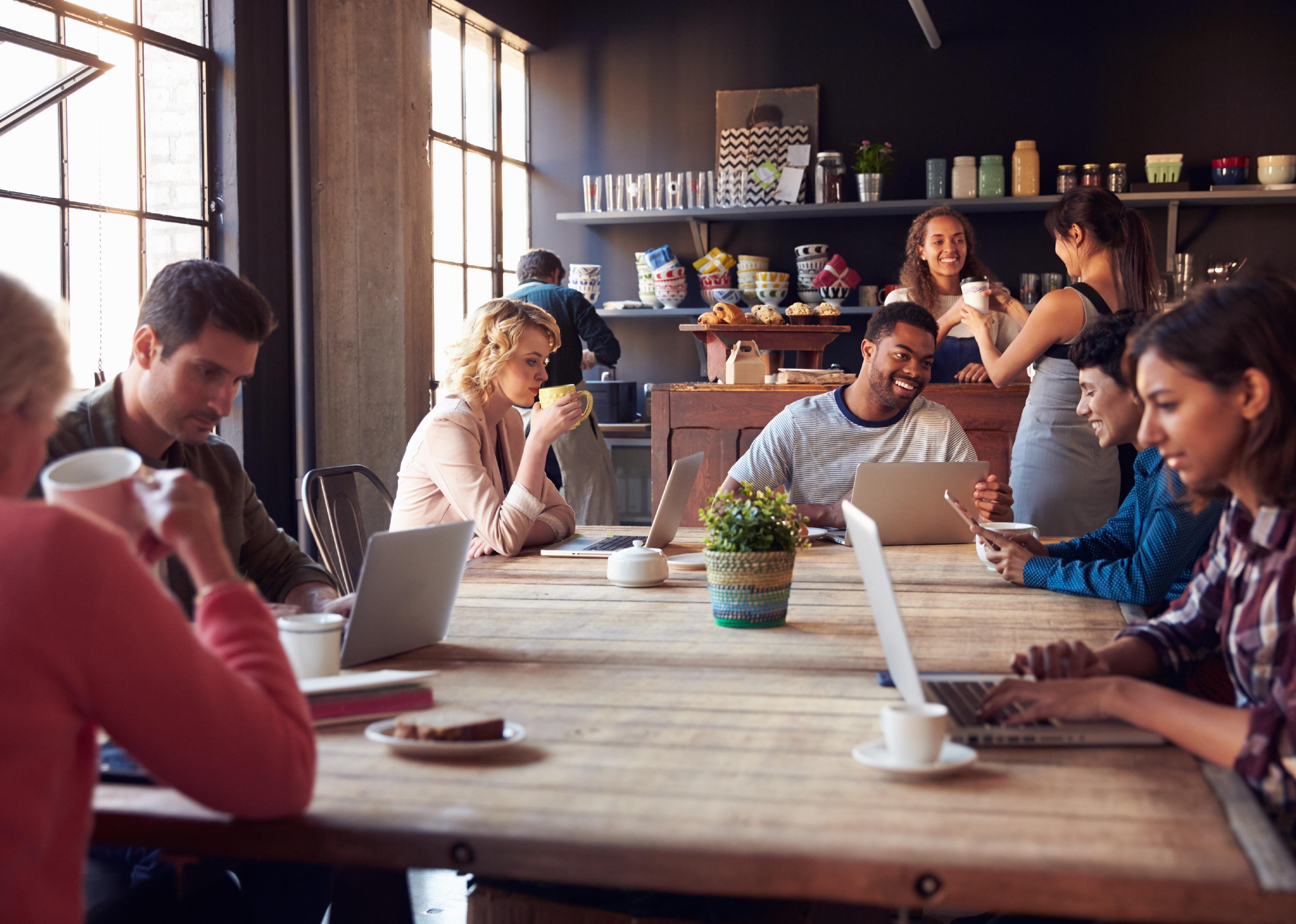 Interior of busy cafe with customers on computers.