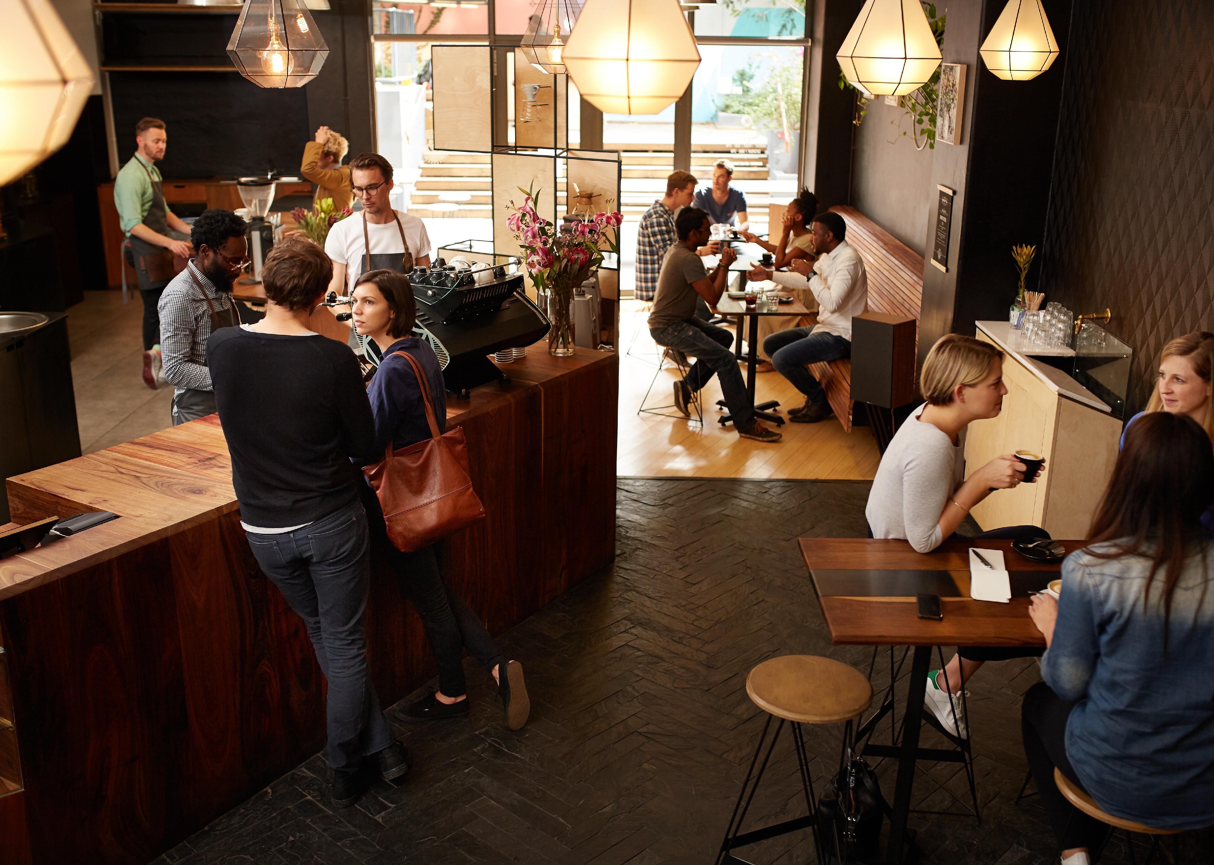 Customers waiting at counter in a busy modern coffee shop.