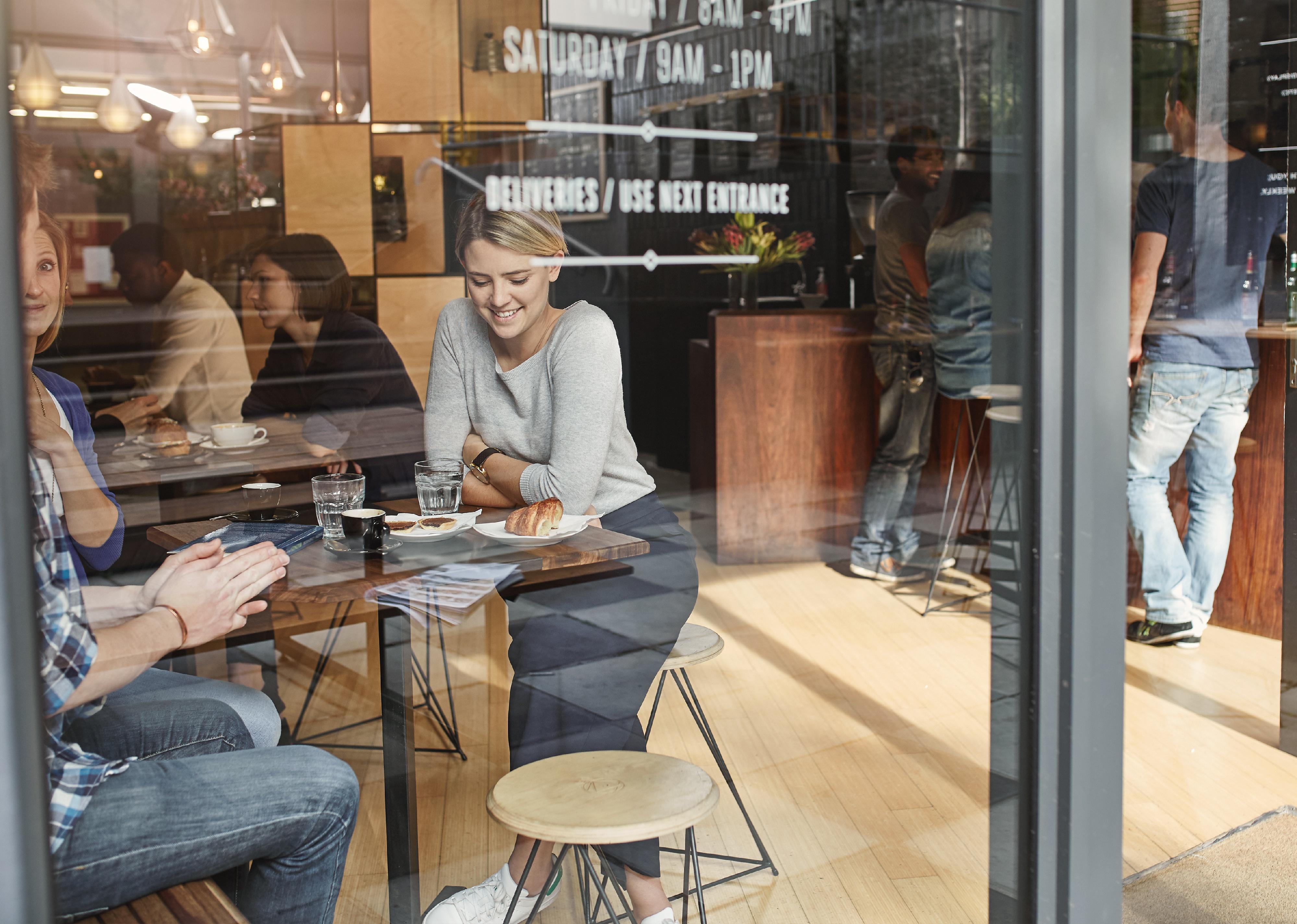 Woman seen through glass window smiling while having coffee with friend.