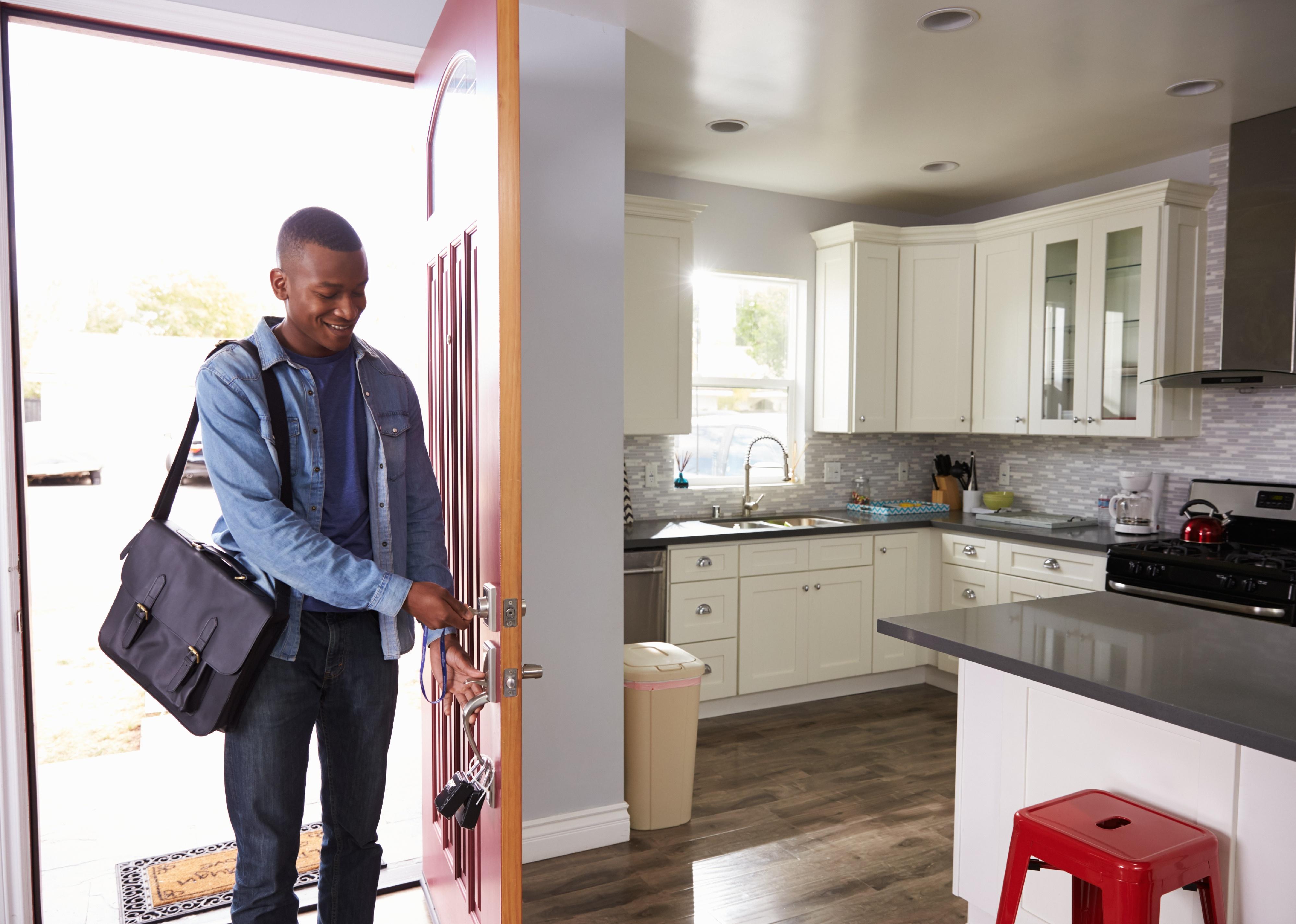 Man coming home and opening front door of apartment.