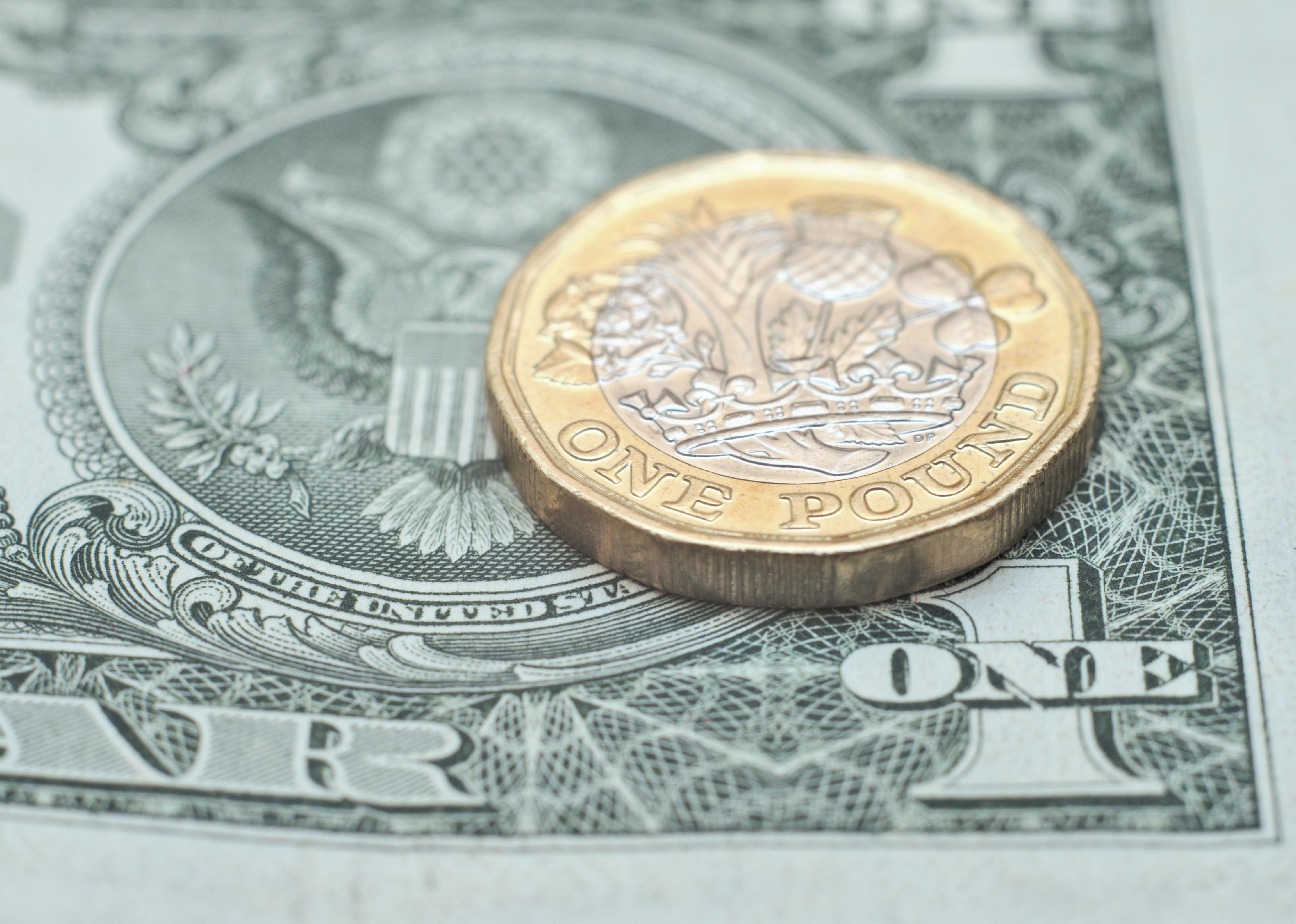 Pound coin sitting on a dollar bill.
