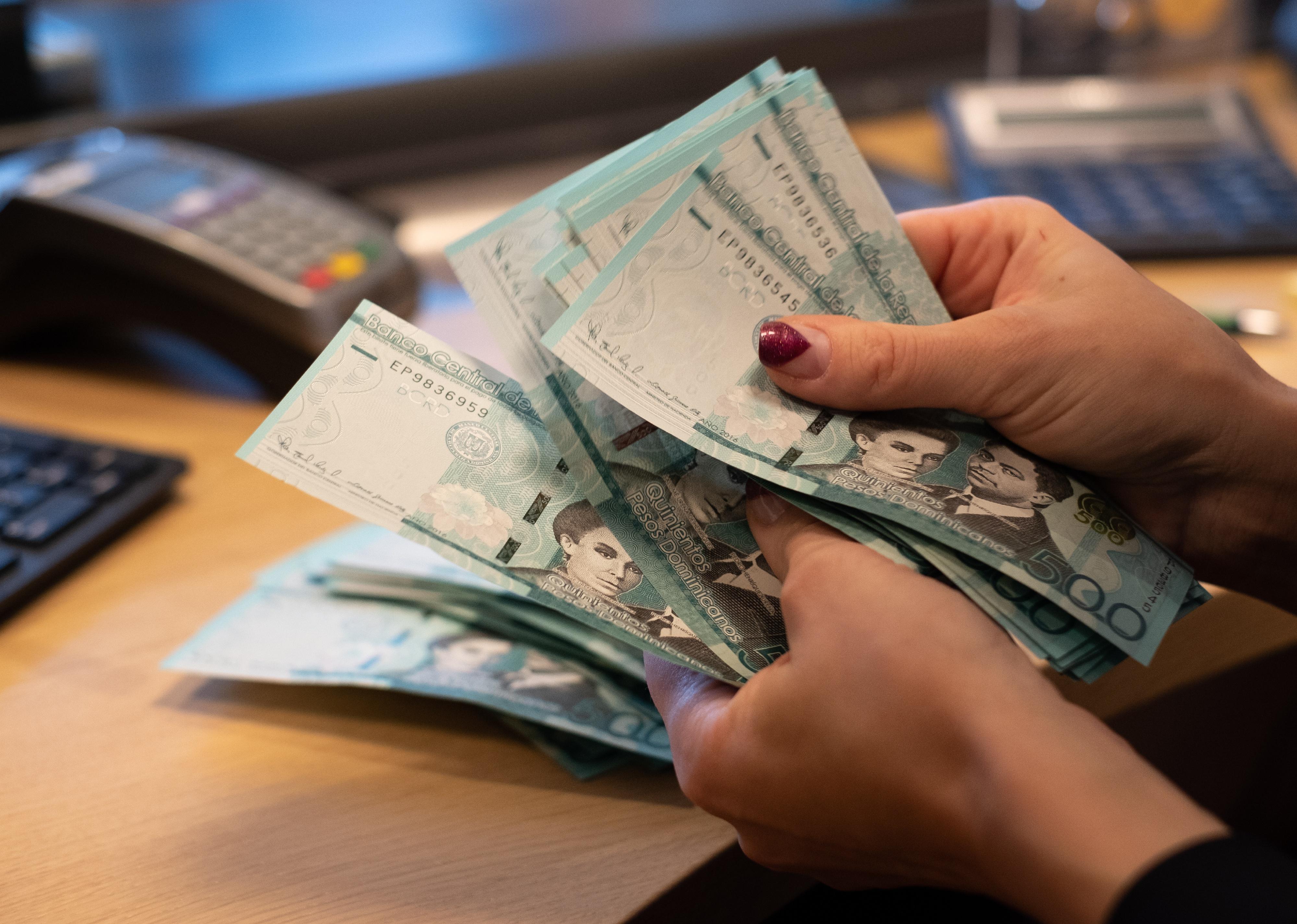 Cashier counting Dominican Republic 500 peso bank notes.