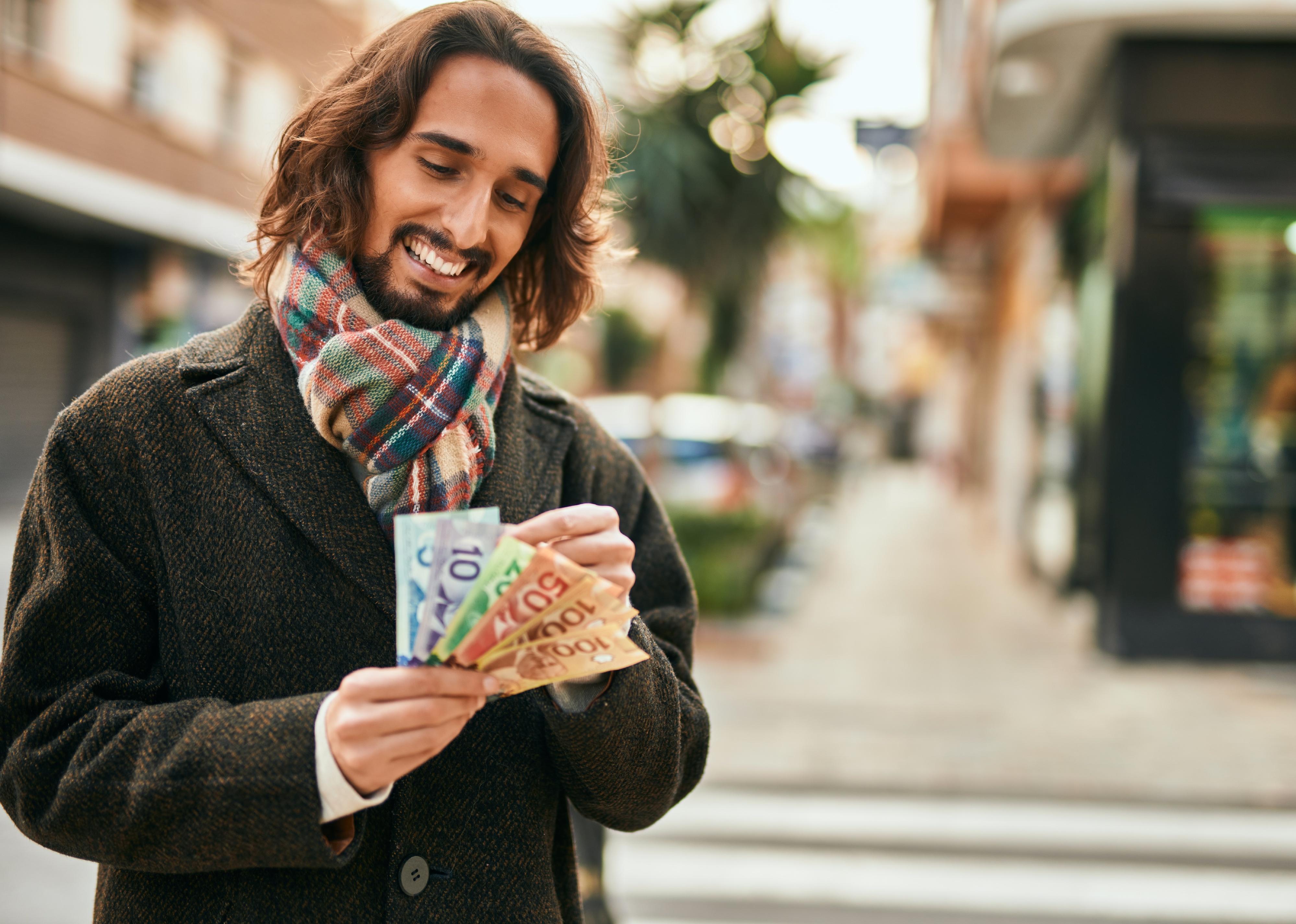 Young man smiling counting Canadian dollars in a city.