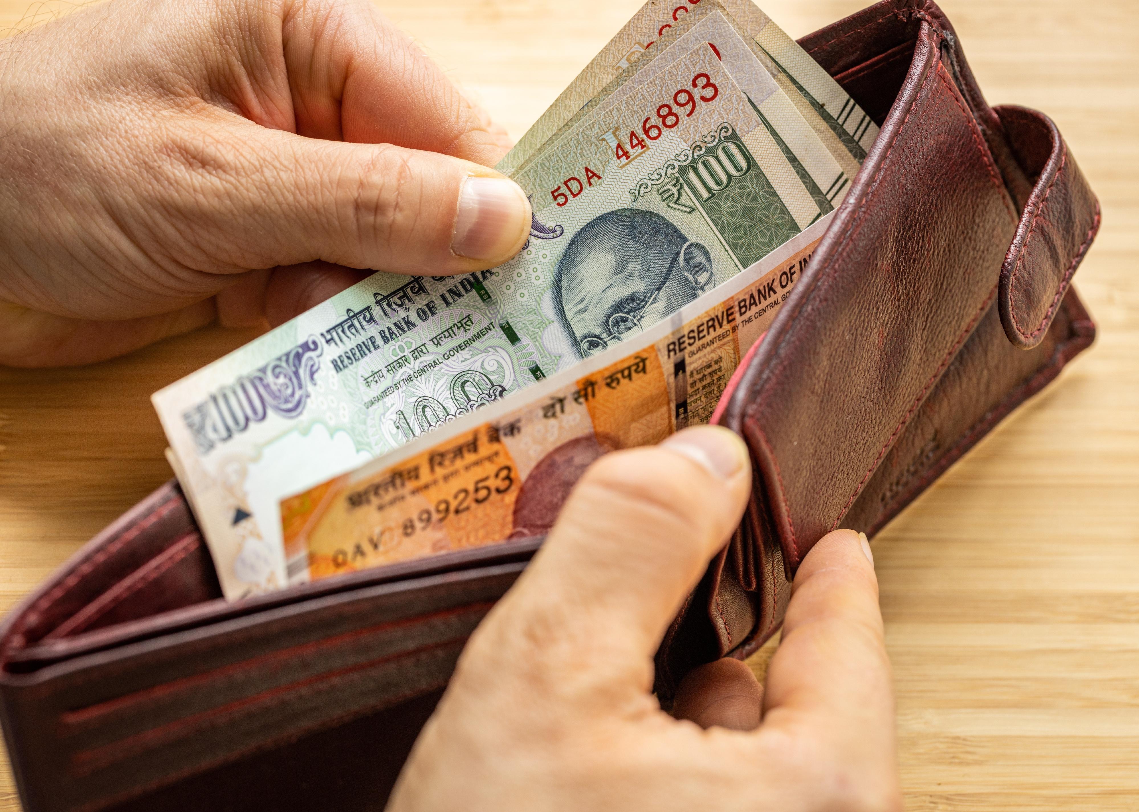 Hand takes out India Banknotes from wallet.