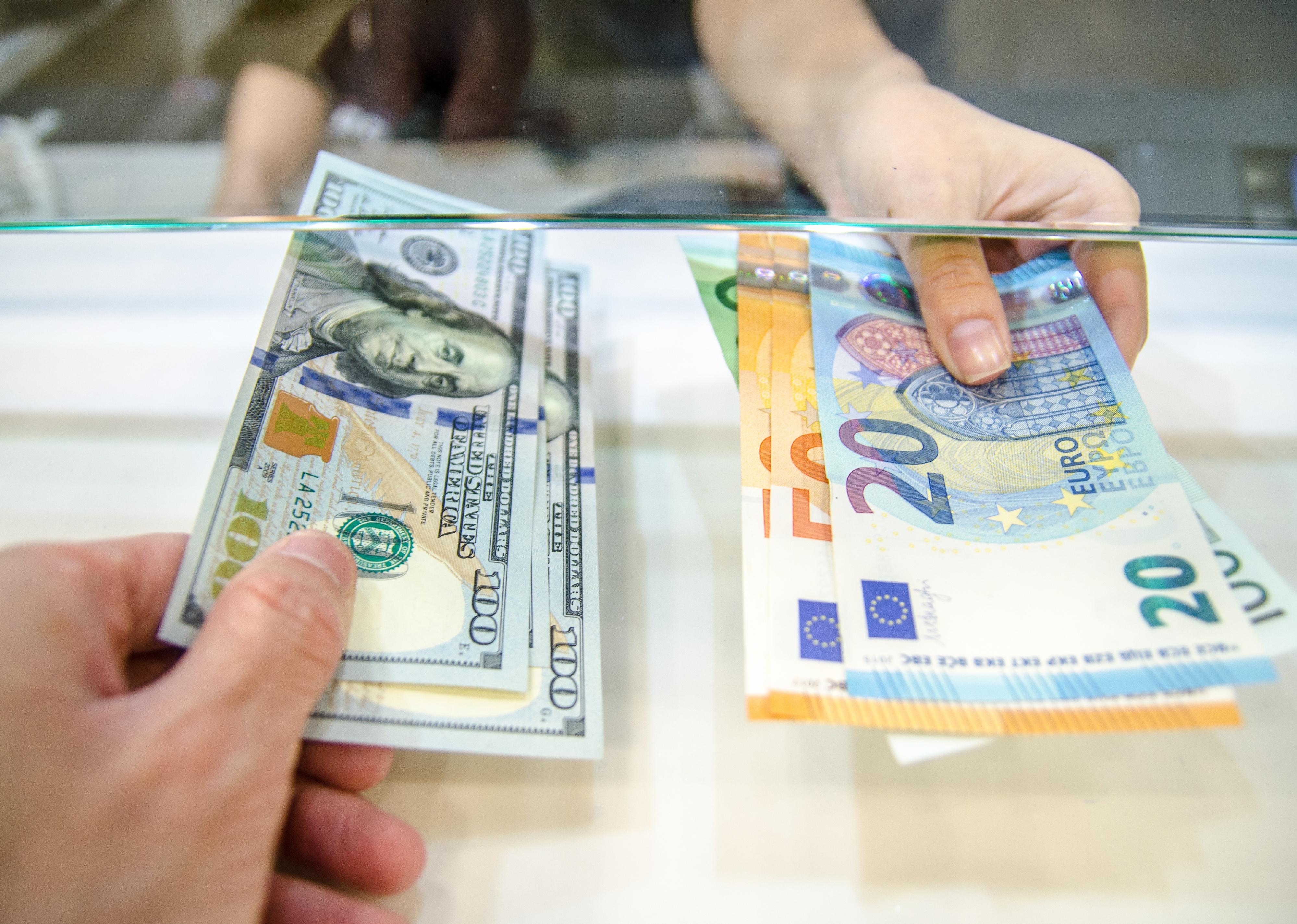 Two people exchanging dollars for euros.