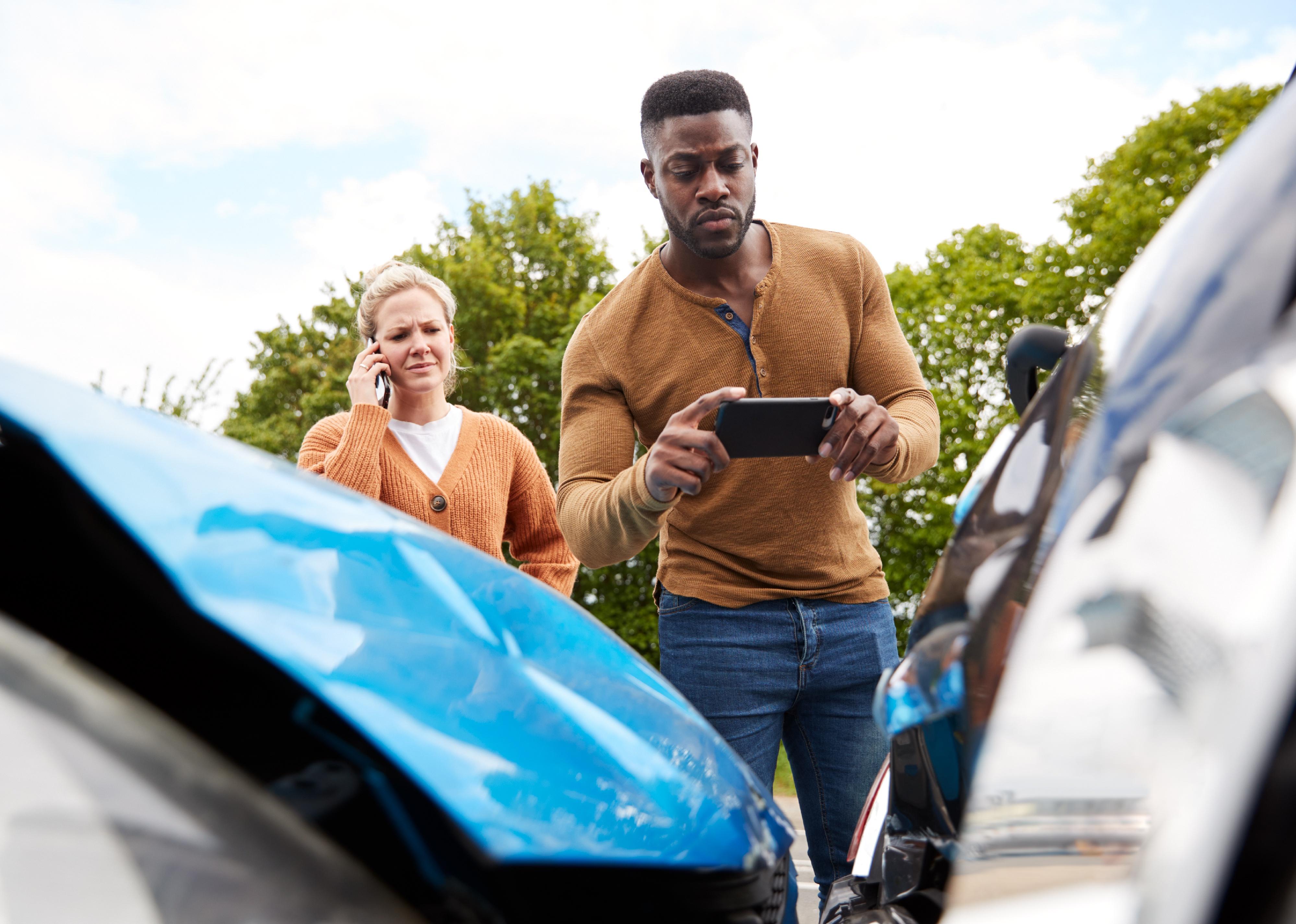 A man involved in car accident taking a picture of damage for an insurance claim while a woman is on the phone behind him..