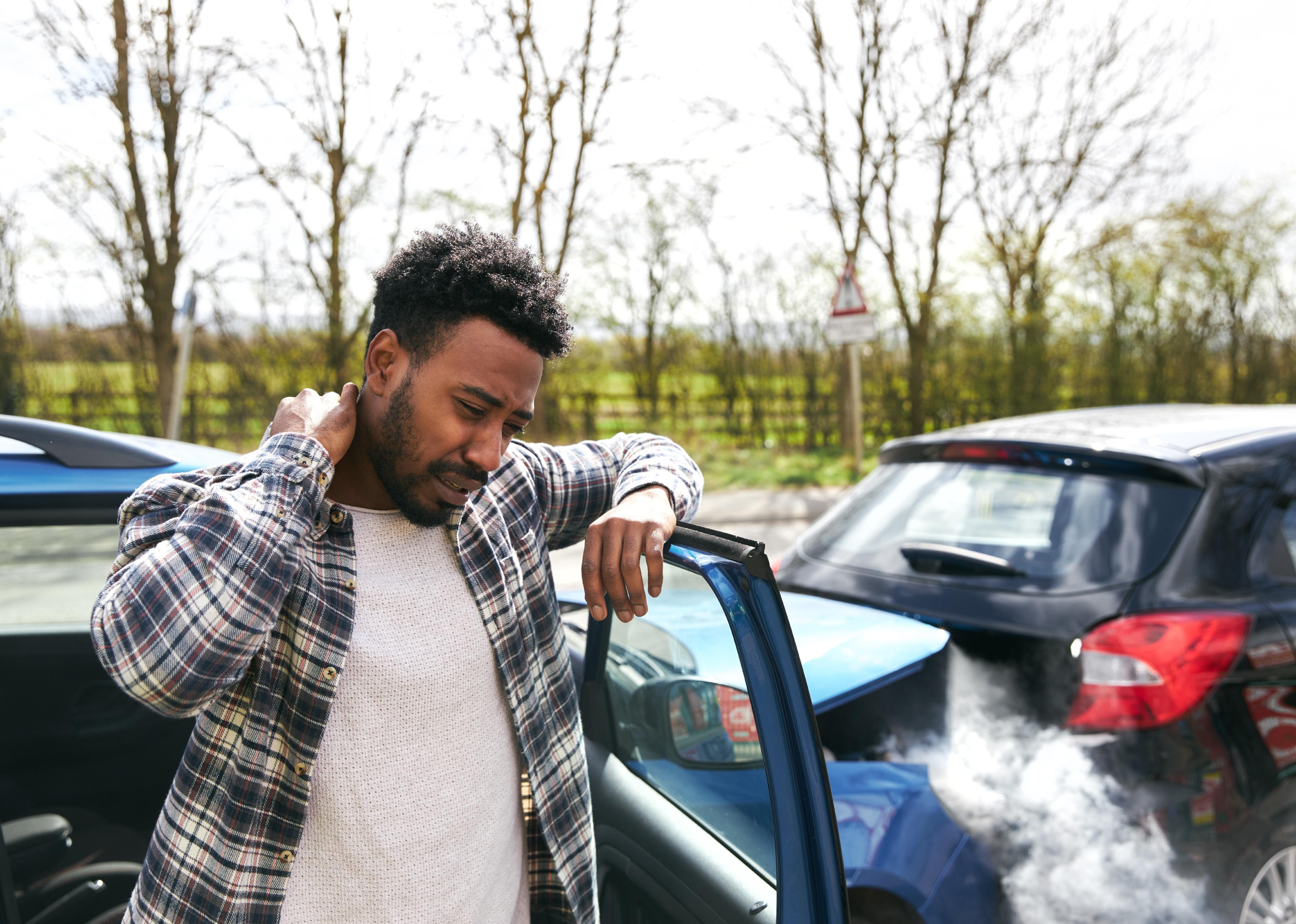 A driver leaning on a car door, rubbing his neck in pain from whiplash injury.
