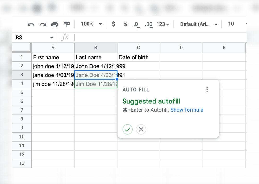 A screenshot of a spreadsheet showing a suggestion to autofill an entire column with a function which is being applied to a block of data with first and last names and dates of birth in messy formatting.